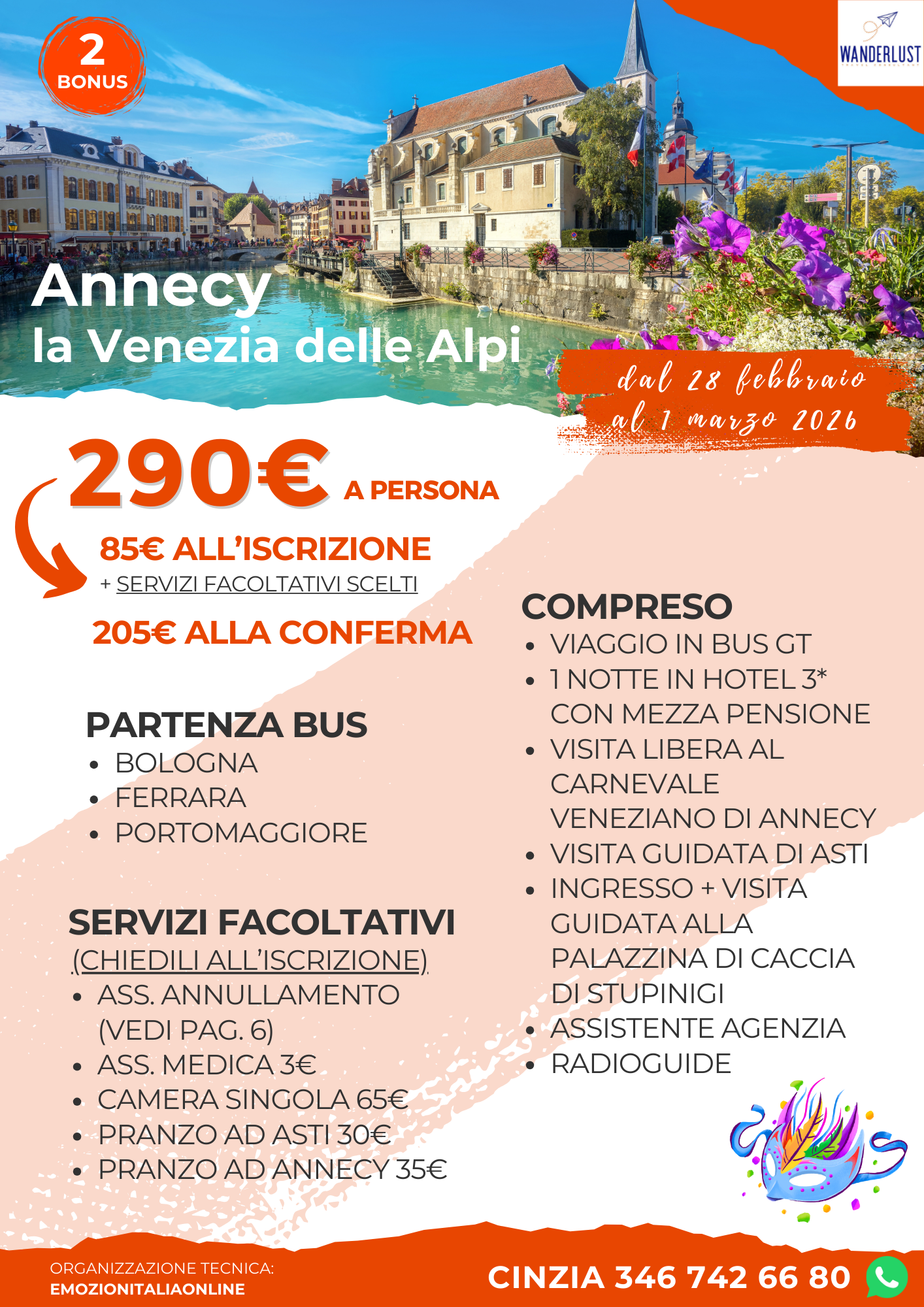 Dopo la colazione effettueremo il check-out e partiremo verso Annecy, una delle destinazioni più iconiche dell’Alta Savoia. La città, definita la “Venezia delle Alpi” per i suoi canali, i ponti fioriti e il contesto lacustre di alto livello, ospita l’attesissimo Carnevale Veneziano, un evento di richiamo internazionale che trasforma il centro storico in un palcoscenico a cielo aperto fatto di maschere, costumi scenografici e atmosfere sospese tra eleganza e tradizione. Avrete tempo libero per vivere l’esperienza in autonomia, mentre per il pranzo proponiamo in un ristorante del centro un menù con antipasto, secondo e acqua inclusa al costo di 35 euro a persona. Nel pomeriggio ripartiremo in bus verso i luoghi di provenienza.
