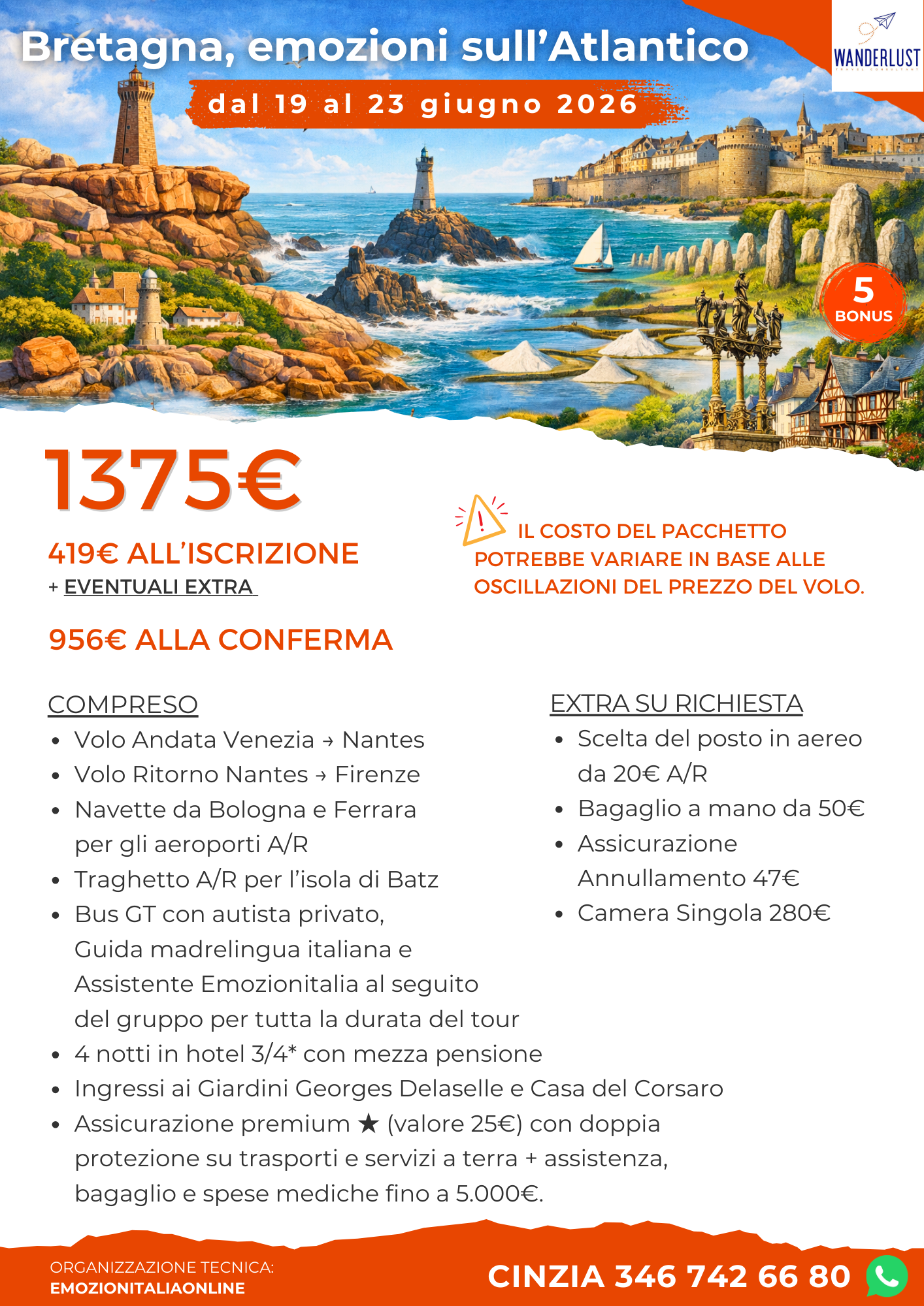 Partiremo da Bologna e Ferrara con bus navetta privato in direzione dell’aeroporto di Venezia, dove ci attenderà il volo per Nantes. All’arrivo incontreremo la guida che ci accompagnerà durante il tour per poi salire a bordo del nostro bus privato. Effettueremo una sosta per il pranzo libero a Saint-Nazaire, città affacciata sull’estuario e legata al grande respiro dell’Atlantico. Nel pomeriggio proseguiremo con un itinerario panoramico che ci accompagnerà verso una delle aree più caratteristiche della regione, con passaggio nella zona di Guérande, celebre per le sue saline, per la produzione del rinomato sale bretone e per il paesaggio unico che unisce terra, acqua e luce. Sarà prevista anche una piacevole passeggiata nel borgo storico, racchiuso da affascinanti mura medievali e ricco di atmosfera. Al termine della visita riprenderemo il nostro percorso verso Vannes, elegante città d’arte e di storia affacciata sul Golfo del Morbihan. Dopo l’arrivo in hotel e il check-in, avremo un po’ di tempo per rilassarci e sistemarci nelle camere. Seguirà la cena e, in serata, usciremo per una piacevole passeggiata nel centro storico, così da iniziare a scoprire l’atmosfera autentica di Vannes tra vicoli, piazzette e scorci di grande fascino.