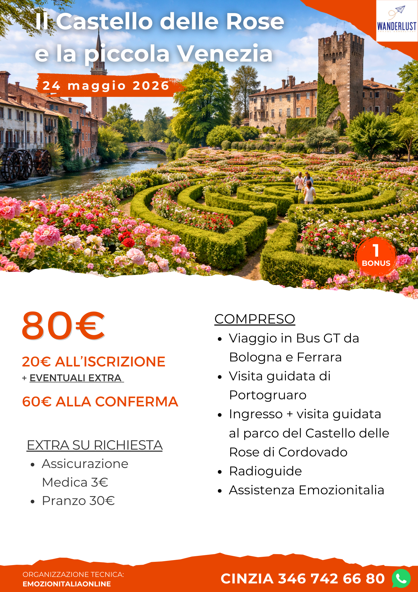 Partiremo in bus da Bologna e Ferrara per raggiungere Portogruaro, elegante cittadina veneta dal fascino raccolto, spesso definita una piccola Venezia di terraferma per la presenza di canali, ponti e scorci di grande atmosfera. All’arrivo incontreremo la guida e inizieremo la visita del centro storico, passeggiando tra vie porticate e angoli di grande suggestione fino a raggiungere gli antichi Mulini di Sant’Andrea, uno degli scorci più caratteristici e fotografati di Portogruaro. Proseguiremo verso il Duomo di Sant’Andrea, affiancato dal celebre campanile, noto per essere il terzo più pendente d’Italia. Al termine della visita è prevista la pausa pranzo libera. Per chi lo desidera, proponiamo un pranzo facoltativo al costo di 30 € a persona con il seguente menù: risottino agli asparagi bianchi e verdi di Bibione, lombata in sfoglia croccante al rosmarino con patata farcita ed erbette in casseruola, coppa gelato ai frutti di bosco, con caffè, acqua e vino della casa inclusi. Nel pomeriggio ci sposteremo a Cordovado, uno dei Borghi più belli d’Italia, piccolo gioiello friulano dal forte impatto scenografico. Qui visiteremo il suggestivo Castello delle Rose, un complesso di grande eleganza immerso in un’atmosfera romantica e senza tempo. La visita guidata comprenderà la Chiesa Medievale, il parco, il celebre Labirinto delle Rose, il cortile e la caratteristica Calle degli Artigiani. Al termine della visita, partenza per il viaggio di rientro verso i luoghi di provenienza.