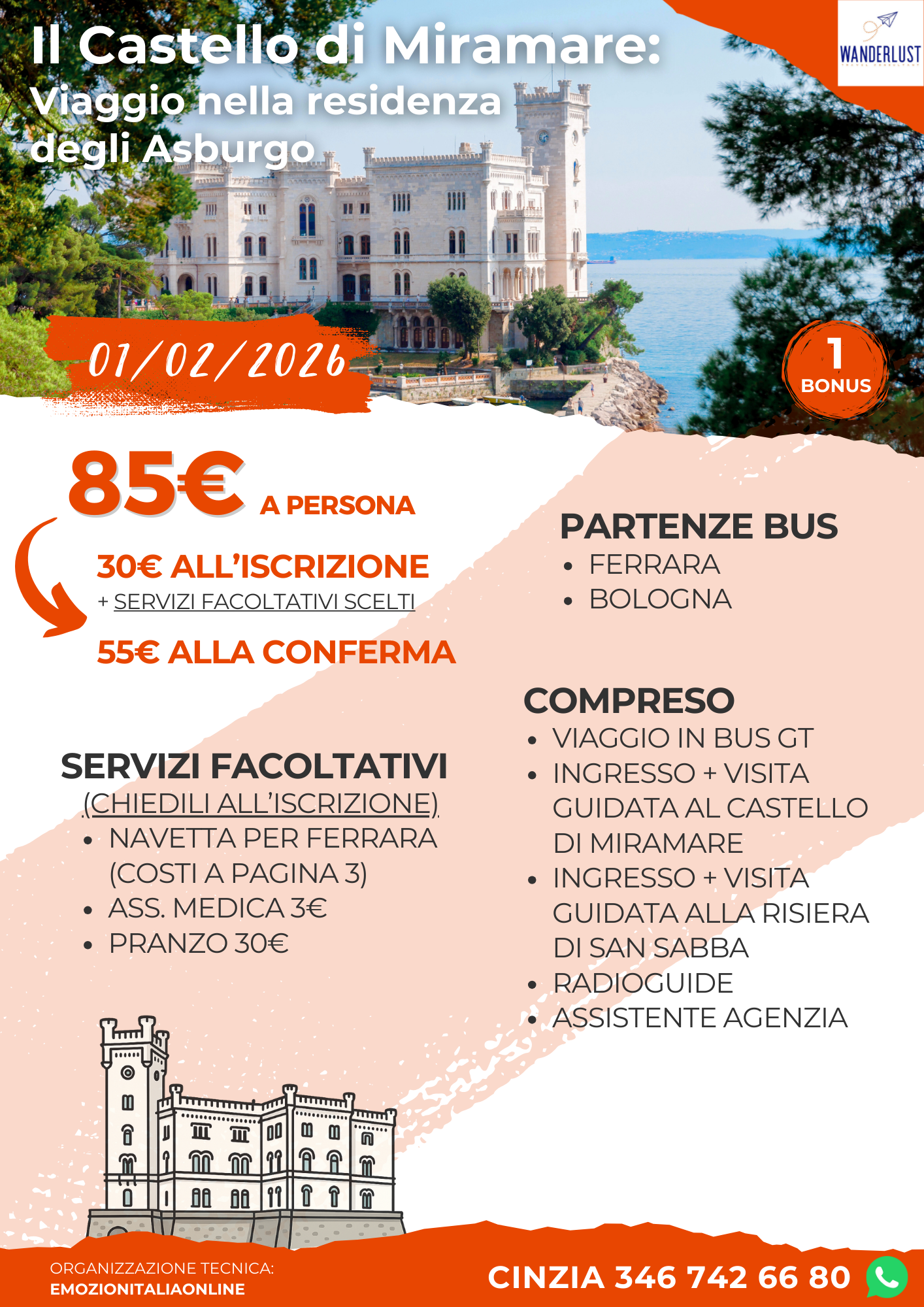 Partiremo da Bologna e Ferrara in bus con destinazione Castello di Miramare, icona asburgica affacciata sul Golfo di Trieste. La visita guidata sarà focalizzata sugli ambienti storici della residenza di Massimiliano e Carlotta e includerà anche una passeggiata nel parco monumentale, un modello ottocentesco di giardino all’inglese e all’italiana, tra viali panoramici, serre, statue e punti scenografici sul mare. Al termine della visita raggiungeremo il centro di Trieste per il pranzo libero. Per chi lo desidera proponiamo un menù completo a 30 euro, composto da Spatzle verdi con burro, salvia e ricotta affumicata e Cevapcici alla piastra con patate in tecia, con inclusi mezza minerale, una bibita piccola a scelta tra birra, vino o analcolica, oltre a caffè e coperto. Nel pomeriggio ci sposteremo in bus verso la Risiera di San Sabba, uno dei luoghi più significativi della memoria storica italiana ed europea. Originariamente un opificio per la pilatura del riso, nel 1943 venne trasformato dalle autorità naziste in campo di detenzione, smistamento e polizia, utilizzato per imprigionare partigiani, oppositori politici, ebrei e civili destinati alla deportazione. È l’unico sito in Italia riconosciuto come ex lager nazista con forno crematorio, elemento che ne definisce la drammaticità e il valore testimoniale. La visita guidata ci accompagnerà attraverso gli spazi originali, le celle, il cortile e l’area museale, con un percorso che approfondirà il contesto storico dell’occupazione tedesca.