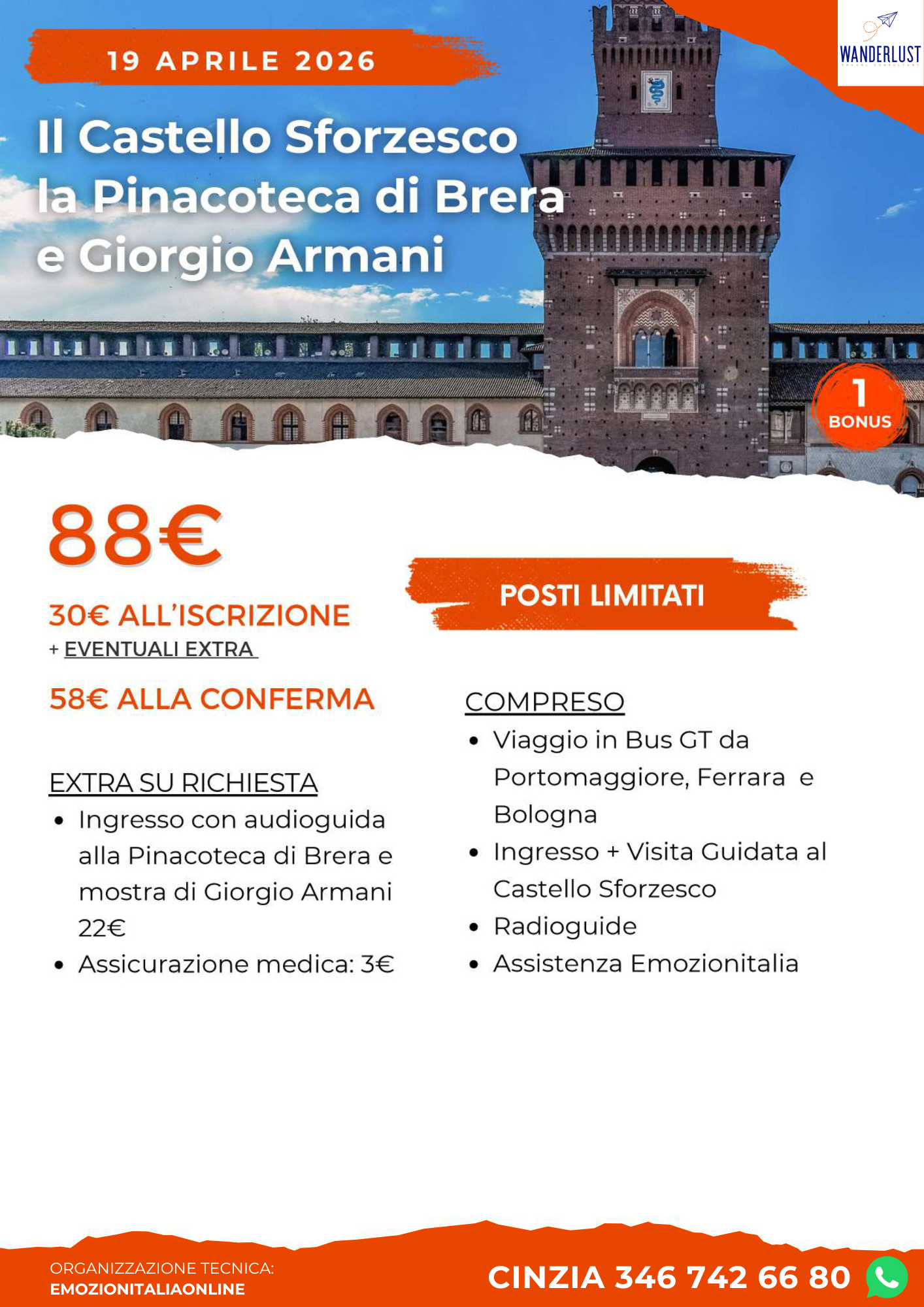 Partiremo la mattina in bus da Portomaggiore, Ferrara e Bologna con destinazione Milano. Arriveremo in Piazza Castello dove inizierà la nostra visita guidata al più imponente e importante monumento di Milano: il Castello Sforzesco. Eretto nel XV secolo da Francesco Sforza, Duca di Milano, è annoverato tra i più grandi castelli d’Europa. Visiteremo sia gli esterni che gli interni che custodiscono diversi musei tra i quali la Pinacoteca, ( vedremo solo le opere più prestigiose) e il più famoso Museo della Pietà Rondanini, che accoglie l’ultimo struggente capolavoro di Michelangelo Buonarroti, che riflette un continuo processo di trasformazione, diventando simbolo di profondità spirituale e tensione emotiva. Al termine ci dirigeremo verso il quartiere Brera, anche noto come il “quartiere degli artisti” per la sua atmosfera bohémien, le strade acciottolate, i caffè pittoreschi e la celebre Pinacoteca di Brera. Tempo libero per il pranzo in uno dei suoi caratteristici ristorantini . Nel pomeriggio tempo libero per visite libere mentre per chi lo desidera proponiamo una visita libera facoltativa con audioguida( 20€) alla celebre Pinacoteca di Brera che conserva incredibili e iconici capolavori come il Cristo morto di Mantegna, il Bacio di Hayez, la Madonna con Bambino di Piero della Francesca, la Cena di Emmaus di Caravaggio, lo Sposalizio della Vergine di Raffaello e tantissimi altri capolavori e all’interno delle sale si potranno ammirare gli abiti-capolavori di Giorgio Armani, in una mostra a lui dedicata, che dialogheranno con le splendide opere della pinacoteca: una chicca imperdibile!!!. Al termine partenza per il rientro ai luoghi di prove nienza, previsto in prima serata.
