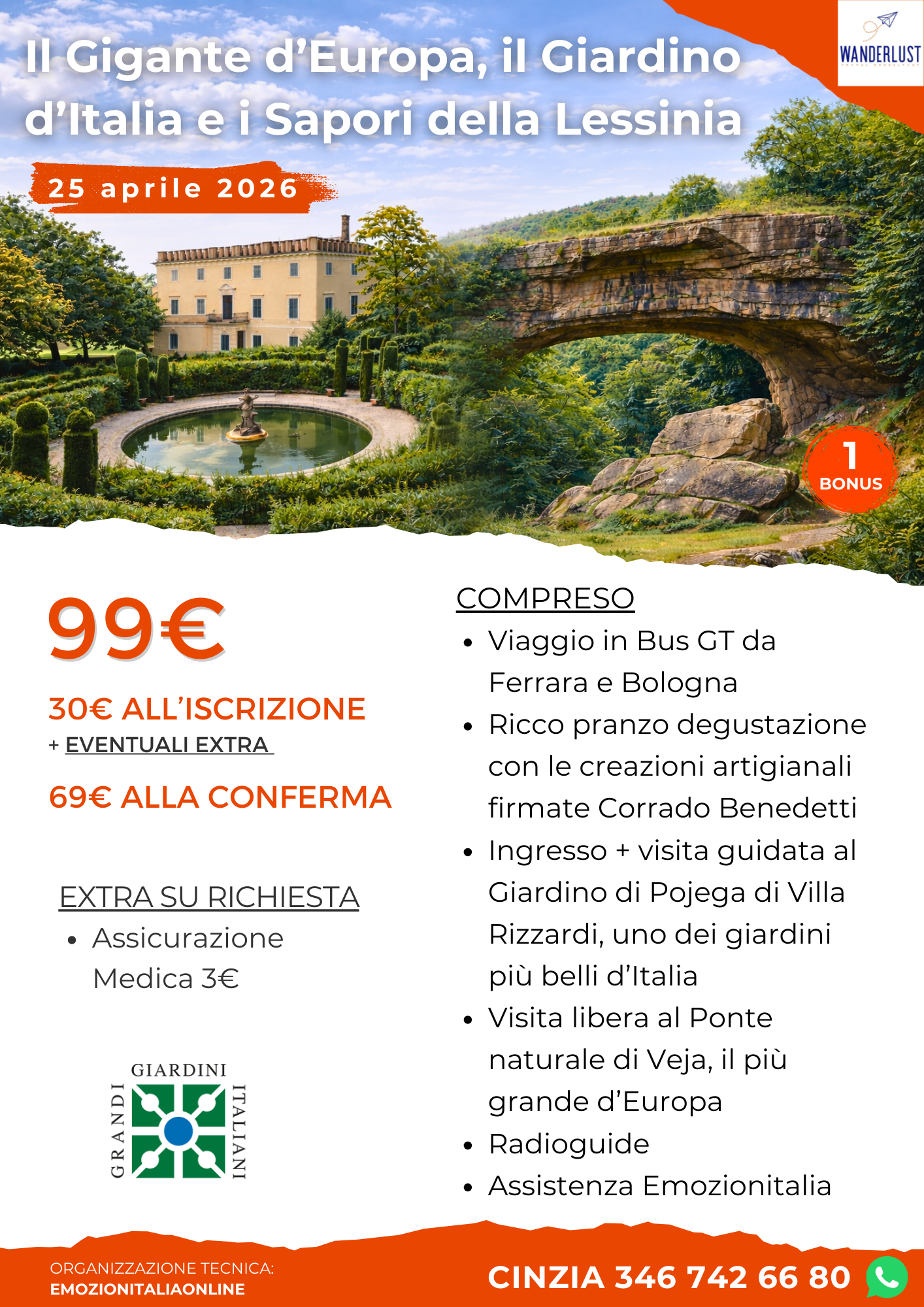 Partiremo in bus da Bologna e Ferrara in direzione Valpolicella per raggiungere Villa Rizzardi a Negrar, dove ci attende la visita guidata al Giardino di Pojega, considerato uno degli ultimi e più affascinanti esempi di giardino all’italiana. Qui la natura diventa scenografia: siepi scolpite, fontane e statue dialogano con scorci sorprendenti e spazi iconici come il Tempio, il Teatro e il Belvedere, in un percorso settecentesco che regala un’atmosfera elegante e quasi “sospesa”, tra geometrie perfette, acqua e verde che si fondono in un colpo d’occhio davvero memorabile. Al termine faremo visita al maestro Corrado Benedetti in Lessinia, per una tappa gourmet dedicata alle sue eccellenze artigianali: un ricco pranzo degustazione con carne salà di manzo condita con Grana Padano DOP e olio extravergine d’oliva, 5 salumi e 5 formaggi della rinomata selezione, accompagnati da mostarda e gelatina, pane artigianale, acqua e vino rosso IGT. A chiudere, caffè e pasticceria artigianale secca e tempo libero per acquistare i prodotti in negozio. Nel pomeriggio andremo a visitare il Ponte di Veja, il ponte naturale più grande d’Europa e uno dei monumenti geologici più importanti della Lessinia. Questo è ciò che resta di un’enorme grotta carsica: un crollo spettacolare della volta che ha creato un arco di pietra imponente, che da secoli alimenta un immaginario quasi mistico e che ha ispirato viaggiatori, artisti e poeti, tra cui Dante Alighieri.