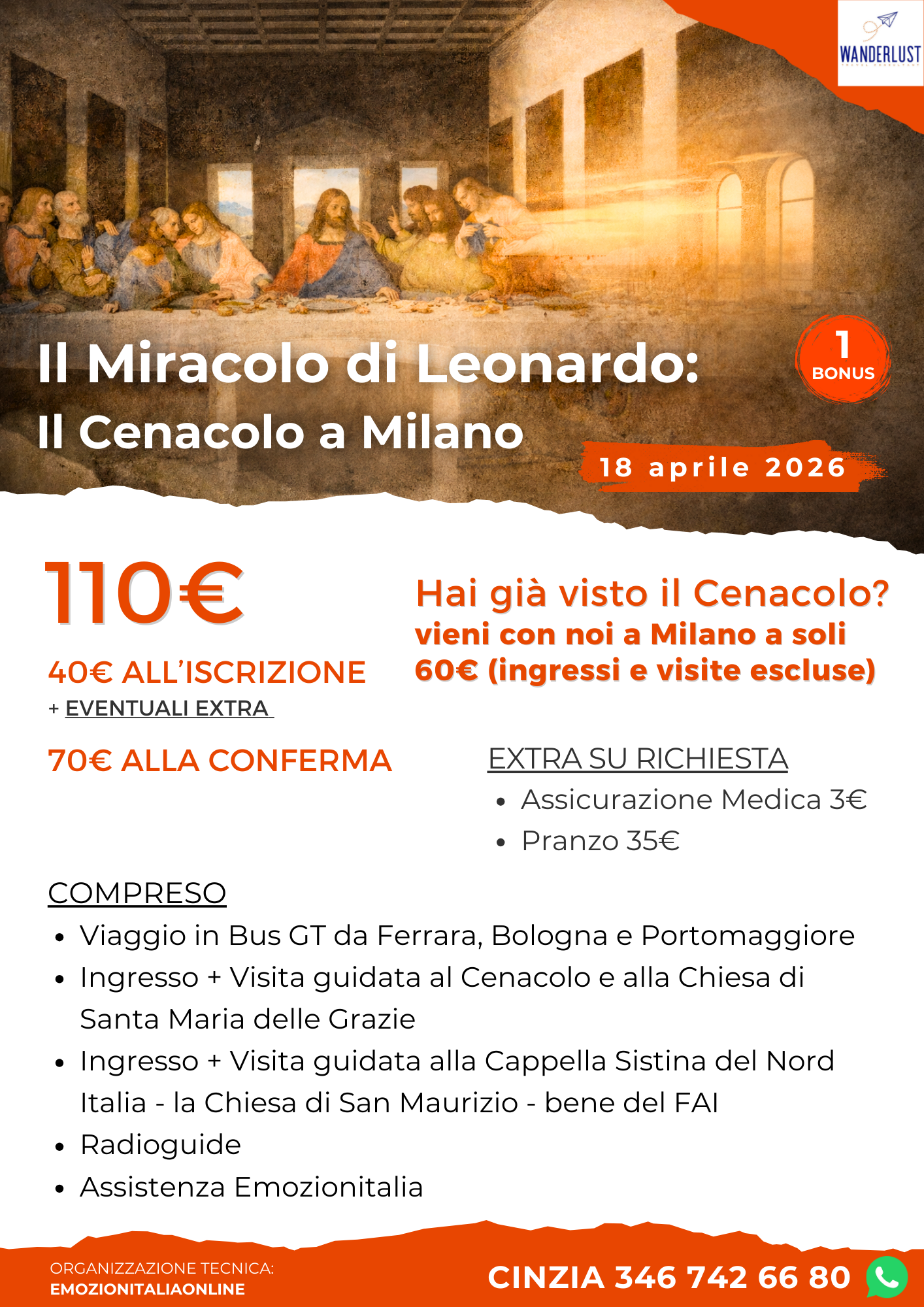 Partiremo la mattina in bus da Portomaggiore, Ferrara e Bologna con destinazione Milano. All’arrivo ci sposteremo verso il complesso di Santa Maria delle Grazie, riconosciuto Patrimonio UNESCO. Il cuore del percorso è la contemplazione guidata dell’Ultima Cena di Leonardo da Vinci: lo sguardo si concentra sulla figura di Gesù e si apre poi sui dodici apostoli, leggendo i loro “moti dell’animo”, i gesti, gli sguardi e la regia compositiva con cui Leonardo porta il realismo a un livello rivoluzionario. A completare il racconto, le vicende straordinarie dell’opera e del complesso: dalla pranzo libero. Per chi lo desidera, suggeriamo un menù tipico in un ristorante del borgo al costo di 35€ a persona (acqua inclusa) con tagliere di salumi e formaggi con piadina e un bis di primi: tagliatelle al ragù di selvaggina e gnocchetti al formaggio di fossa e noci. Nel pomeriggio ci sposteremo a Pennabilli per visitare la Casa dei Mandorli, la dimora dove Tonino Guerra ha vissuto dal 1989 e che è legata in modo diretto al suo immaginario e alla sua quotidianità. A seguire proseguiremo con lo spazio museale il Mondo di Tonino Guerra, gestito dall’Associazione Culturale, che valorizza opere e percorso culturale del Maestro, promuovendo attività sul territorio. Questo spazio incantevole trova ospitalità nei sotterranei del trecentesco Oratorio di Santa Maria della Misericordia e racconta perfettamente le opere artistiche del Poeta.
