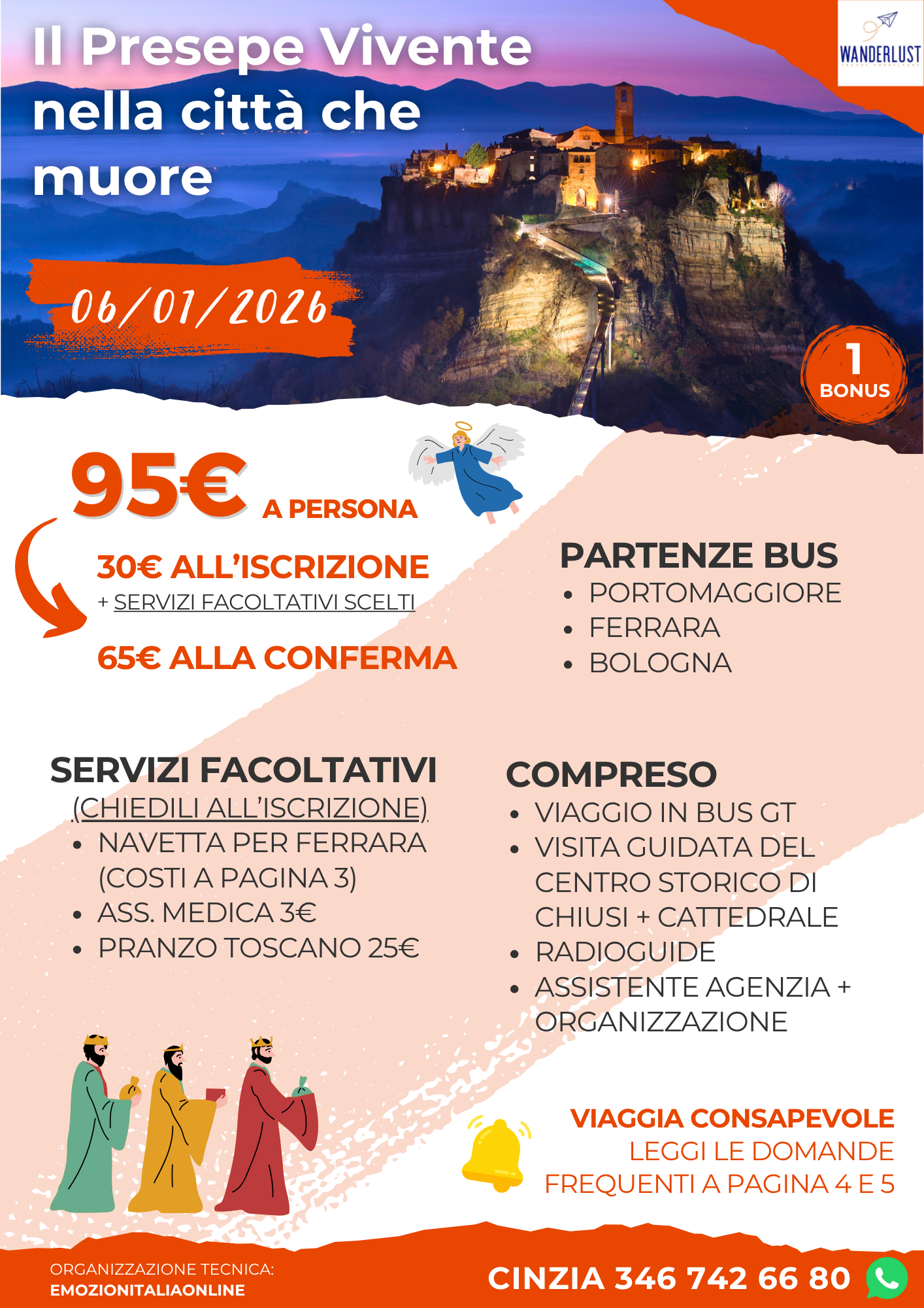 Partiremo in bus da Portomaggiore, Ferrara e Bologna per raggiungere Chiusi, antica città etrusca al confine tra Toscana e Umbria, ricca di fascino e testimonianze storiche. Qui ci attenderà una visita guidata del suggestivo centro storico, con i suoi vicoli medievali e le vedute panoramiche sulla Val di Chiana, e della Concattedrale di San Secondiano, una delle chiese più antiche della Toscana, edificata su una basilica paleocristiana e decorata con splendidi affreschi e mosaici. Al termine della visita, pranzo toscano in un’osteria del centro con un menù che prevede bis di primi con ribollita e pici all’aglione, arrosto misto accompagnato da insalata (acqua inclusa) al costo di 25€ a persona.