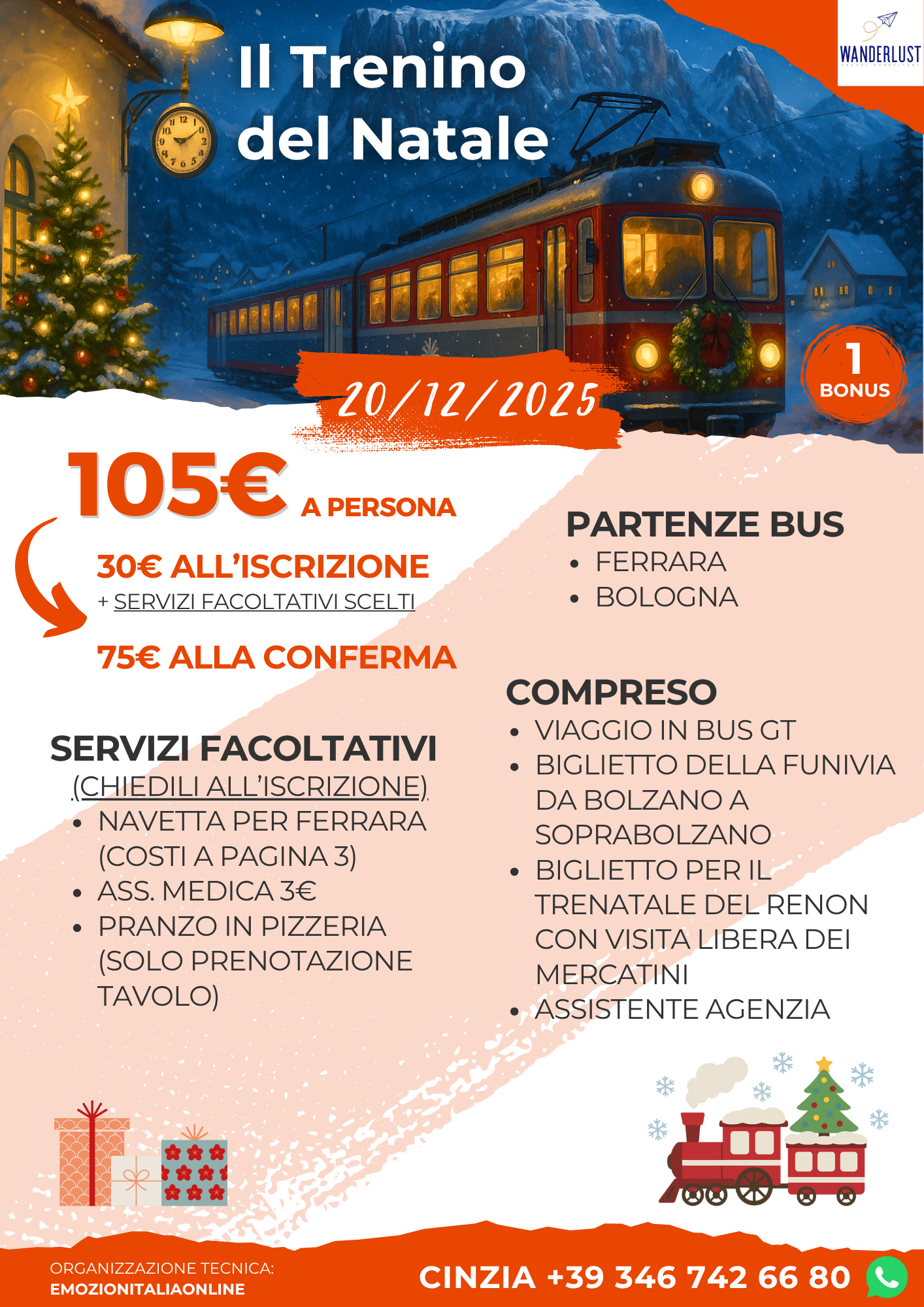 Partiremo in bus da Bologna e Ferrara in direzione Bolzano, dove saliremo a bordo della suggestiva funivia del Renon: un percorso panoramico di circa 12 minuti che regala una vista spettacolare sui tetti di Bolzano e sulle cime innevate delle Dolomiti. Giunti a Soprabolzano, ci immergeremo nell’atmosfera fiabesca dei mercatini di Natale, tra bancarelle di legno, profumo di vin brulè e specialità altoatesine. Durante il tempo libero sarà possibile pranzare in una pizzeria-ristorante convenzionata (prenotazione obbligatoria all’iscrizione). Nel primo pomeriggio saliremo sul Trenatale del Renon, che attraversa incantevoli paesaggi alpini fino a Costalovara, per visitare il Maso Plattner, antica casa contadina oggi sede del Museo dell’Apicoltura. All’interno si trovano collezioni storiche, strumenti tradizionali e filmati dedicati al mondo delle api. Durante il periodo natalizio l’ingresso è gratuito e all’arrivo saremo accolti con un drink di benvenuto. Anche qui non mancheranno espositori con prodotti artigianali e idee regalo. In seguito riprenderemo il treno verso Collalbo. Qui l’artigianato artistico è protagonista: prodotti fatti a mano, decorazioni natalizie e creazioni uniche realizzate da espositori locali di Bolzano e dintorni. In circa dieci minuti a piedi si raggiunge il centro del paese, dove continuano le esposizioni e degustazioni di prodotti tipici. Al termine della visita raggiungeremo il bus per il rientro verso casa.