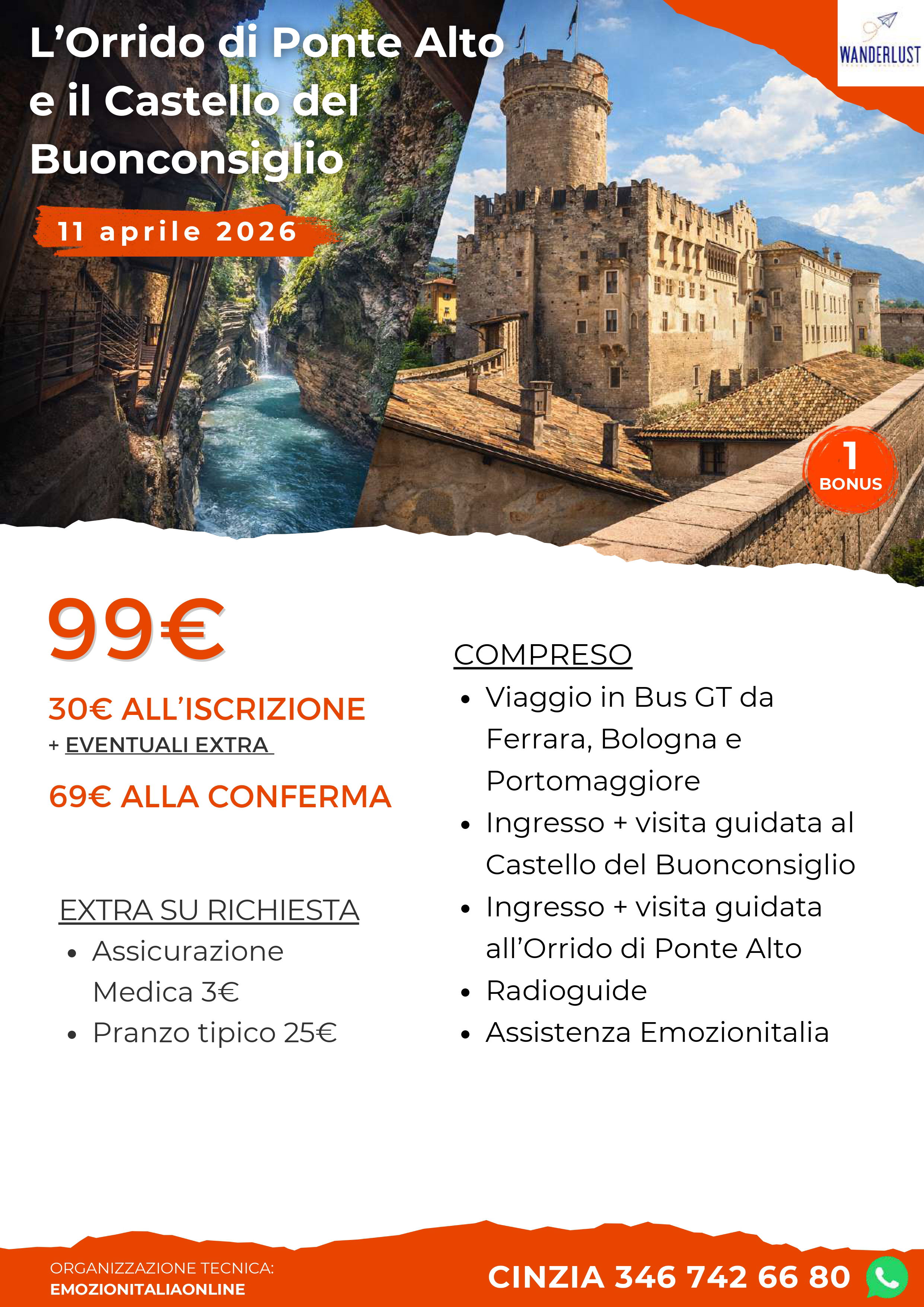 Partiremo al mattino in bus da Portomaggiore, Ferrara e Bologna per raggiungere località Ponte Alto, dove visiteremo l’Orrido con la guida locale. Questa gola naturale, scavata nel tempo dal torrente Fersina, regala un ambiente spettacolare, con pareti di roccia alte e strette, acqua che scorre impetuosa e passaggi attrezzati che permettono di entrare nel cuore dell’orrido tra passerelle, scalinate e scorci suggestivi. Al termine ci sposteremo a Trento, dove avremo tempo libero per il pranzo. Per chi lo desidera, proponiamo una tipica osteria di tradizione, la più antica della città, con menù fisso al costo di 25 euro a persona comprensivo di acqua e caffè: lasagnetta fatta in casa al forno con ragù rustico alla trentina, bocconcini di vitello alla contadina con polenta di mais biologico, verza brasata e strudel di mele e cannella con salsa alla vaniglia. Nel pomeriggio raggiungeremo il Castello del Buonconsiglio per una visita guidata degli ambienti. È il più importante complesso monumentale di Trento, antica residenza dei principi vescovi, e unisce l’impatto della fortezza medievale alla raffinatezza degli spazi rinascimentali. Attraversando cortili, sale di rappresentanza e ambienti storici, la guida ci racconterà come il castello sia stato per secoli il centro del potere cittadino e ci aiuterà a cogliere i dettagli architettonici, le decorazioni e l’evoluzione del complesso nel tempo.