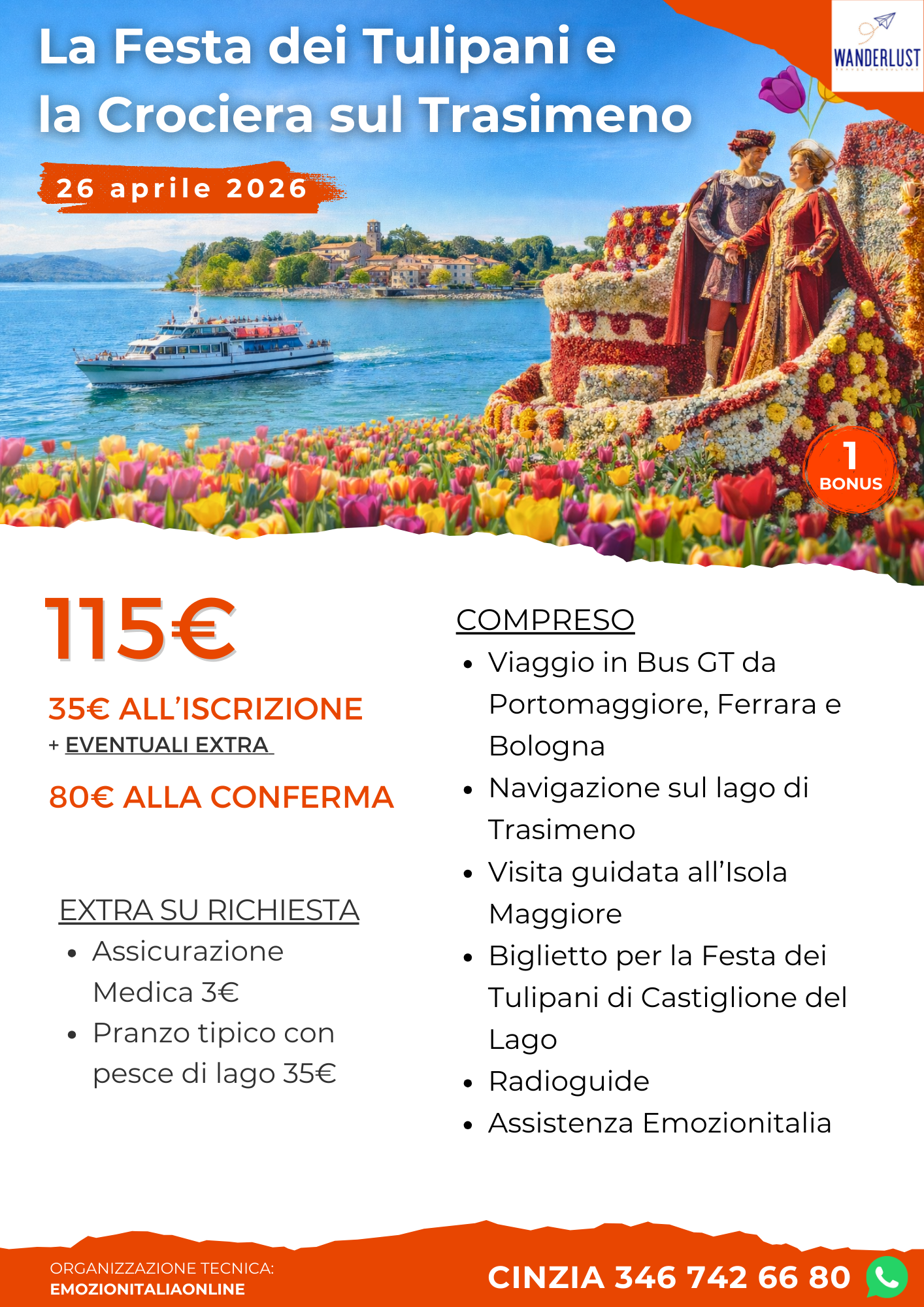 Partiremo in bus da Portomaggiore, Ferrara e Bologna in direzione Passignano sul Trasimeno, dove incontreremo la guida e ci imbarcheremo per raggiungere l’Isola Maggiore. Una volta sbarcati, la visita si svolgerà a piedi tra vicoli e scorci sul lago: attraverseremo il piccolo borgo, con le sue case in pietra e le botteghe, e seguiremo un percorso piacevole tra uliveti, belvedere panoramici e lungolago, con soste nei punti più fotogenici dell’isola per respirare l’atmosfera autentica del Trasimeno. A seguire, proponiamo un pranzo tipico di pesce di lago in un ristorante con splendida vista lago, con menù composto da tagliatelle al ragù bianco di pesce con pachino e pinoli tostati, carpa regina in porchetta e spiedino di persico gratinato al forno, insalata di stagione e acqua inclusa. Nel pomeriggio rientreremo in battello e ci sposteremo a Castiglione del Lago, dove ci attende la Festa del Tulipano: qui avremo tempo libero per vivere il centro in modalità “festival”, tra animazione diffusa, Giardino dei Tulipani, mercato del fiore e mercatini; nel pomeriggio il momento clou sarà con la Grande Parata e gli spettacoli itineranti (corteo storico, street band, artisti di strada e gruppi folkloristici) che accompagnano la sfilata dei carri decorati con petali di tulipano. Al termine della giornata riprenderemo il bus da Castiglione per far ritorno a casa.