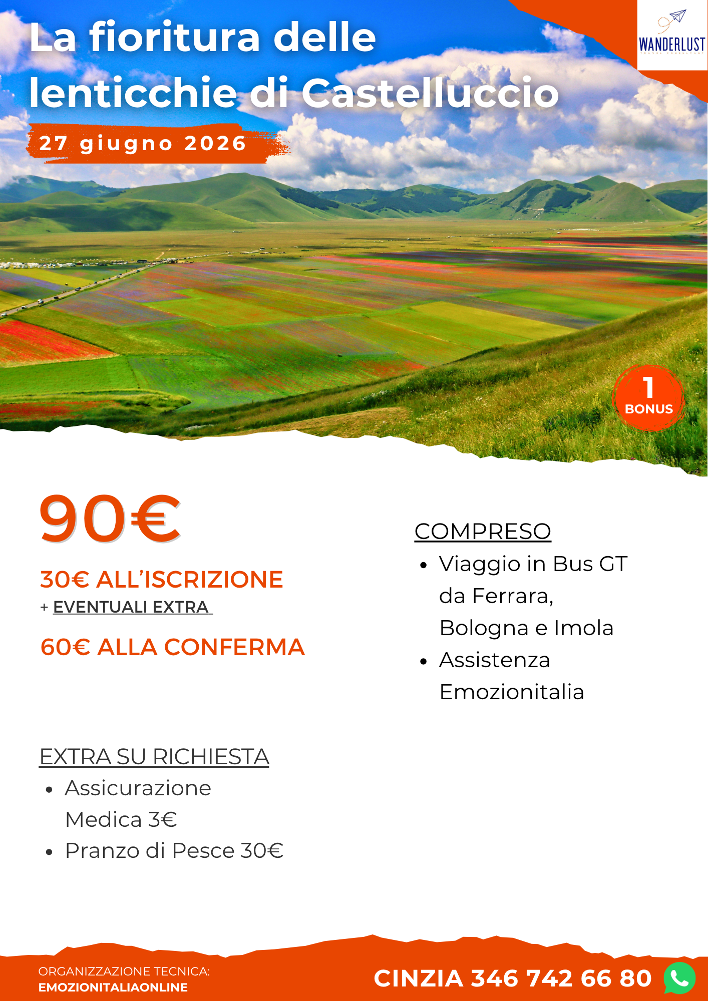 Partiremo in bus da Ferrara, Bologna e Imola per raggiungere Porto Recanati, elegante località affacciata sull’Adriatico, dove avremo del tempo libero per passeggiare sul suo piacevole lungomare, tra profumo di mare, stabilimenti colorati e la rilassata atmosfera di una delle perle della Riviera del Conero. Per chi lo desidera, proponiamo un pranzo facoltativo in ristorante a base di pesce con il seguente menu: spaghetti alle vongole, filetto di pesce del giorno al forno e acqua inclusa, al costo di 30 € a persona. Nel primo pomeriggio ripartiremo in direzione di Castelluccio di Norcia, attraversando un paesaggio di grande fascino fatto di dolci colline, borghi silenziosi e scorci tipici dell’entroterra marchigiano e umbro, in un itinerario panoramico che renderà il viaggio stesso parte dell’esperienza. Una volta arrivati nella celebre Piana di Castelluccio, potremo ammirare uno degli spettacoli naturali più suggestivi dell’Appennino: la famosa fioritura delle lenticchie, che in questo periodo trasforma l’altopiano in un meraviglioso mosaico di colori, tra sfumature di rosso, giallo, blu e viola. Dopo un po’ di tempo libero per passeggiare e godersi questo scenario unico, riprenderemo il viaggio di rientro verso casa.