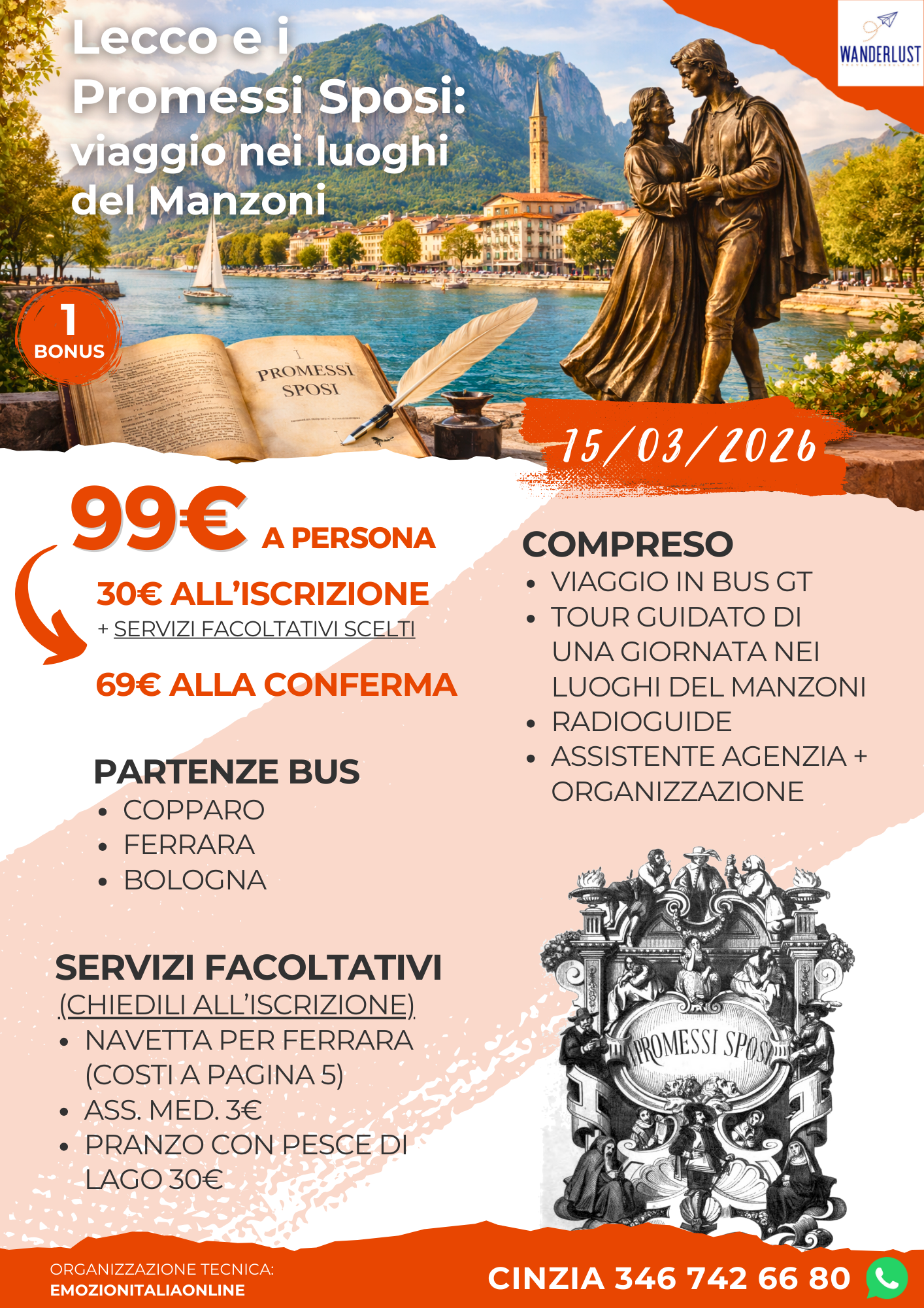 Partiremo in bus da Copparo, Ferrara e Bologna per raggiungere il lungolago di Lecco. Qui incontreremo la nostra guida per iniziare insieme l’esplorazione di Pescarenico, uno dei set naturali più evocativi dei Promessi Sposi. Visiteremo l’ex chiesa dei Cappuccini, ci fermeremo nella piazza dei pescatori, dove ritroveremo la celebre barca di Lucia, e raggiungeremo il punto legato all’“Addio, monti”. Sarà uno di quei momenti in cui si capisce davvero perché Manzoni scelse questi luoghi, con lo scorcio del Resegone che completa la scena in modo quasi cinematografico. Proseguiremo poi verso Olate, il “paesello” dei Promessi Sposi, dove potremo ammirare la presunta casa di Lucia e la ex canonica di Don Abbondio. Per il pranzo avremo massima libertà: potendo scegliere tra locali e ristorantini sul lungolago, oppure aderire alla nostra proposta con menu a base di pesce di lago, perfettamente in tema con il territorio: Filetto di lucioperca in pastella con salsa bernese e Risotto al pesce persico al profumo di limone (Acqua e caffè inclusi), al costo di 30€ a persona. Nel pomeriggio ci aspetta il centro storico di Lecco, con un itinerario ricco di simboli e punti fotografici: la Torre Viscontea, unico resto del castello citato nel romanzo, il monumento dedicato a Manzoni, il suggestivo Palazzo delle Paure e, a chiudere, il profilo inconfondibile del campanile della Basilica di San Nicolò, vero emblema della città.