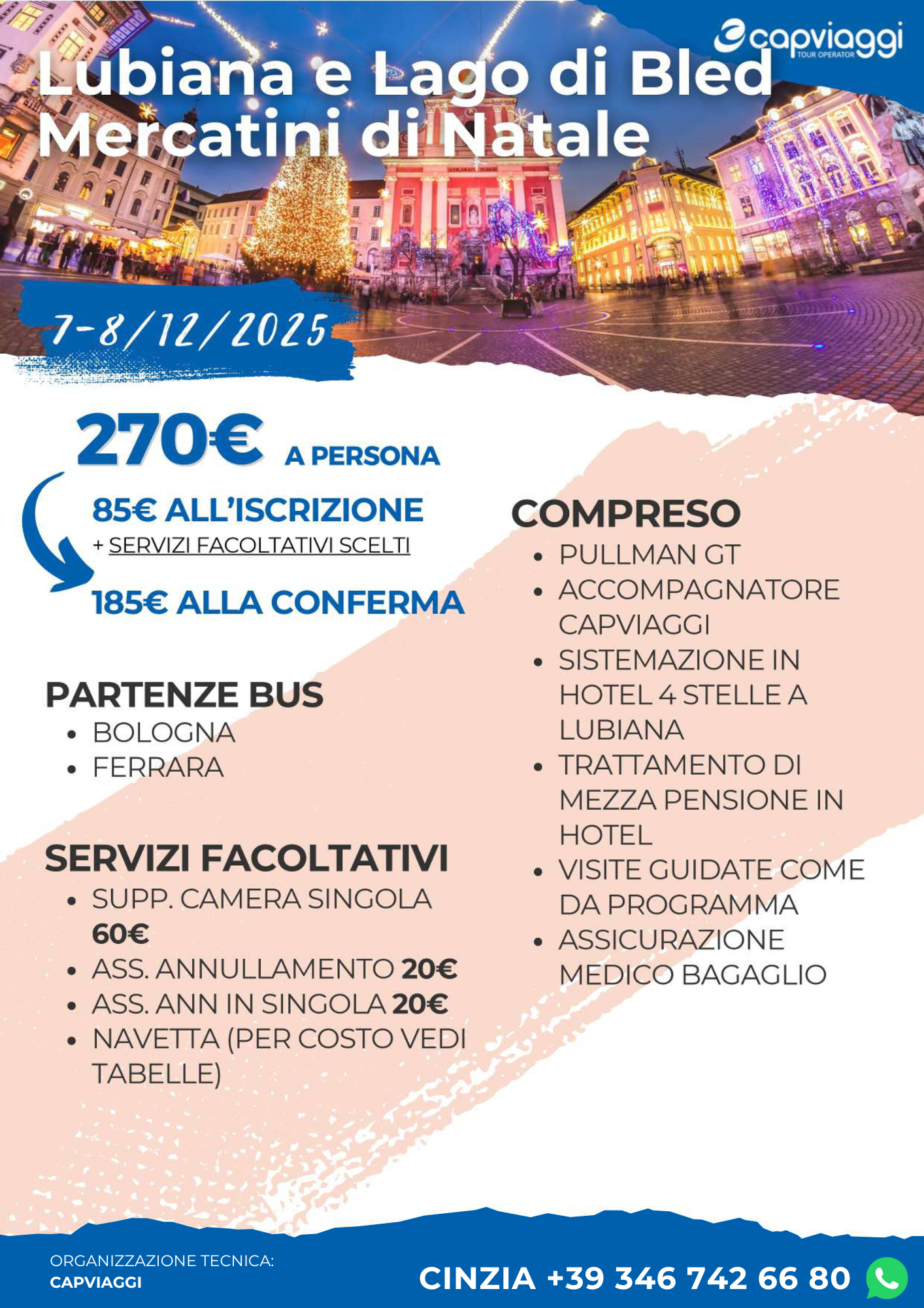 Lubiana – Prima colazione in hotel. Incontro con la guida per visita della città, capitale della Slovenia e maggior centro artistico e culturale del paese. La parte medievale della città è situata sulla sponda destra del fiume Ljubljanica, attorno al castello. Di grande impatto i palazzi monumentali di fine ottocento e la Cattedrale, imponente edificio barocco. Sulla sponda destra della Ljubljanica invece la città conserva memorie dell’antica Emona. Visita del mercatino di Natale, che per tutto il mese di Dicembre colora il centro storico. Pranzo libero. Nel primo pomeriggio, partenza per il viaggio di rientro. Arrivo previsto in serata.