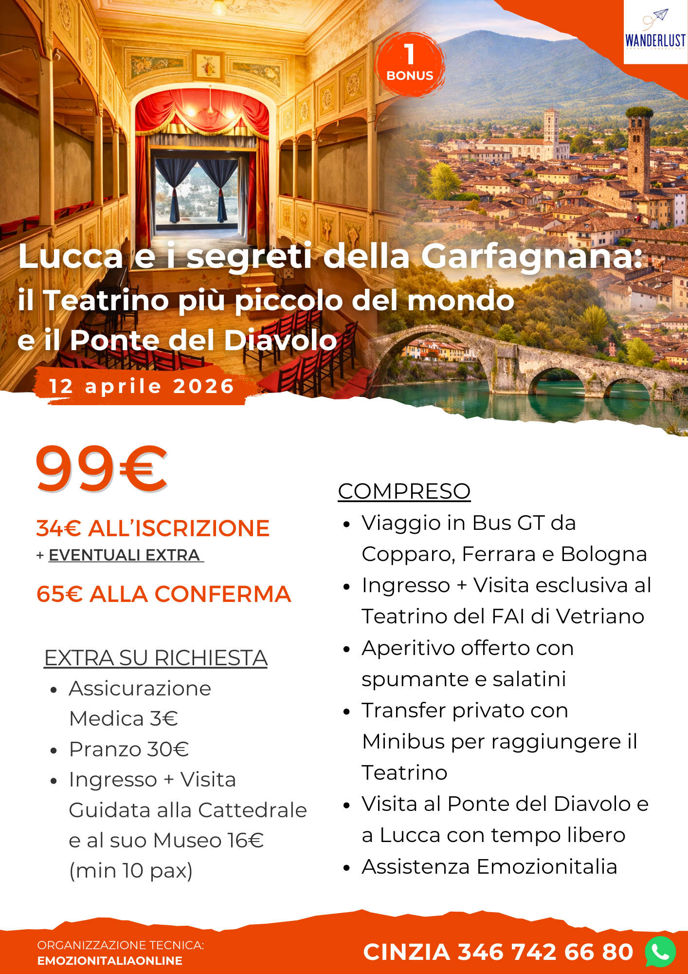Una giornata tra Lucca e la Garfagnana alla scoperta di luoghi unici e affascinanti. Visita esclusiva al Teatrino del FAI di Vetriano, il più piccolo teatro storico del mondo, con aperitivo incluso. Completano l’esperienza il Ponte del Diavolo e il tempo libero a Lucca, per un viaggio originale e ricco di sorprese.