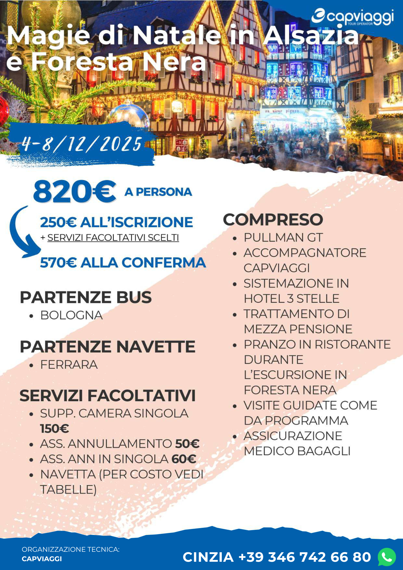 Nel periodo dell' Avvento l'Alsazia e la Foresta Nera si vestono di magia. La capitale Strasburgo vi accoglie nel suo centro storico Patrimonio UNESCO con mille luci e splendidi addobbi; Colmar e le pittoresche cittadine lungo la strada dei vini profumano di spezie e cannella; Friburgo vi attende con il suo mercatino di Natale, allestito nello splendido centro storico.
