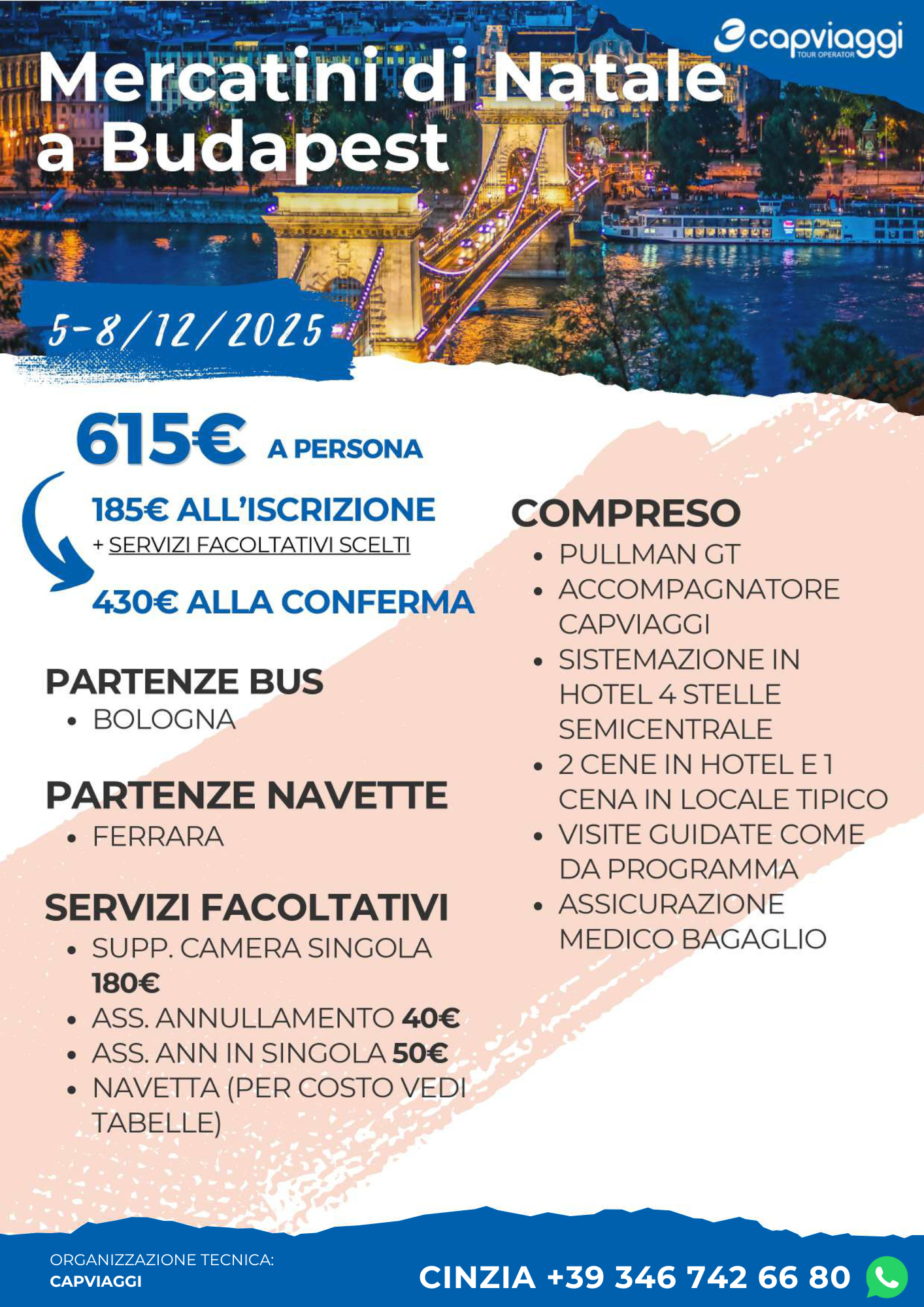 Budapest è una delle capitali più maestose e suggestive d'Europa, riflessa nelle acque del Danubio. Nella centralissima piazza Vörösmarty, a due passi dal fiume e dal celebre Ponte delle Catene viene allestito un grande albero di Natale pieno di luci che sovrasta le bancarelle cariche di artigianato locale dove fare i propri acquisti.