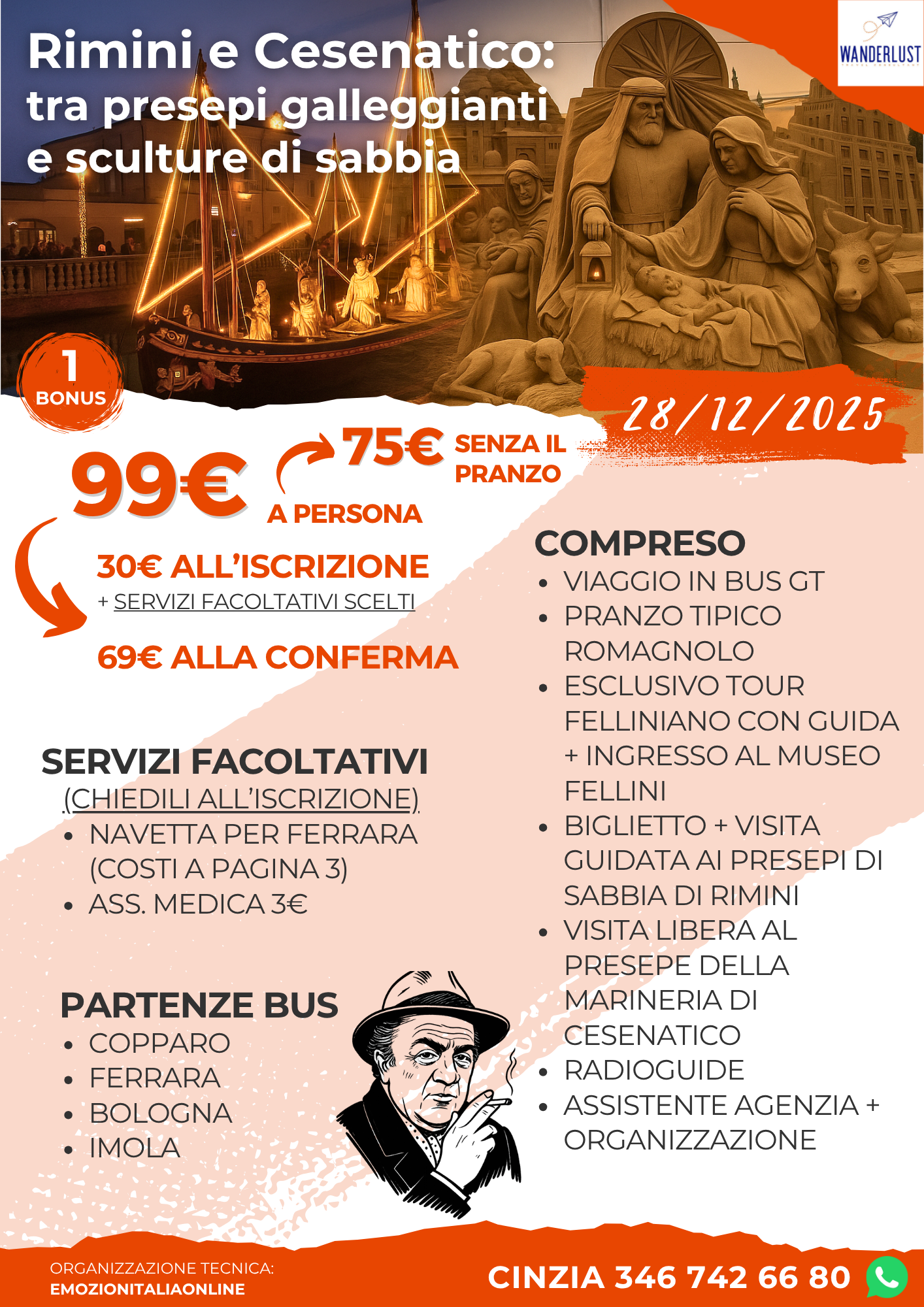Partiremo in bus da Ferrara, Bologna e Imola per raggiungere Rimini. Qui ci attenderà il Tour Felliniano alla scoperta dei luoghi simbolo del grande regista. Il percorso comprende il Fellini Museum, Piazza dei Sogni, Piazza Cavour e una passeggiata nel pittoresco Borgo San Giuliano, con una sosta davanti al celebre Cinema Fulgor. Un itinerario che racconta la Rimini onirica e poetica, fatta di ricordi, visioni e atmosfere sospese tra realtà e immaginazione. Al termine, pranzo tipico in un’osteria del centro con un ricco antipasto di salumi e formaggi nostrani, la tradizionale “Scarpetta” – un tris di sughi serviti con pane casereccio – e strozzapreti al ragù di salsiccia e piselli (acqua inclusa). Nel pomeriggio visiteremo con una guida i Presepi di Sabbia di Rimini, un’imponente installazione artistica sulla spiaggia libera che si estende per oltre 750 m². Le sculture, alte fino a 4 metri, sono realizzate da artisti internazionali che modellano sabbia e acqua per dare vita a un affascinante villaggio della Natività, popolato da personaggi e luoghi scolpiti con straordinario realismo.