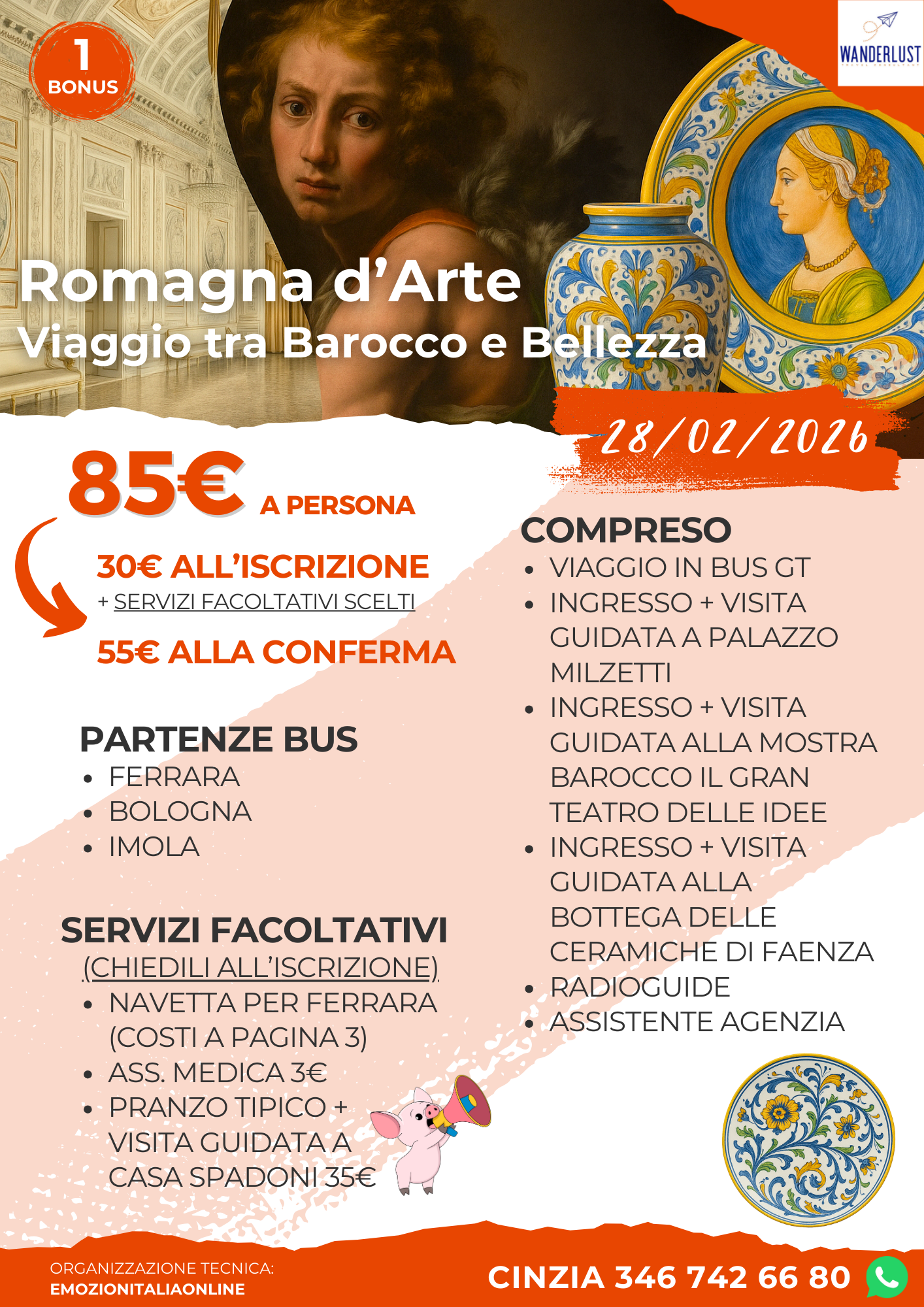 Partiremo in bus da Ferrara, Bologna e Imola per raggiungere Faenza, dove inizieremo la giornata con una visita guidata a Palazzo Milzetti, il più importante esempio di architettura neoclassica in Romagna. Gli ambienti raffinati, le sale riccamente decorate e le scenografie pittoriche che caratterizzano il palazzo permettono di leggere l’eleganza e la visione estetica della fine del Settecento, offrendo un contesto culturale di alto profilo. A seguire, ci sposteremo a piedi attraversando il centro storico e una delle piazze più suggestive d’Italia, per raggiungere una bottega artigiana di ceramica faentina, un luogo in cui la tradizione secolare della maiolica prende forma attraverso le mani degli artigiani. La guida introdurrà il tema della ceramica come patrimonio identitario della città, illustrando tecniche, simbolismo e continuità storica di questo saper fare unico. Terminata la visita, verrà lasciato tempo libero per il pranzo nel centro storico. Come servizio facoltativo proponiamo Casa Spadoni, con la visita guidata all’interno di uno spazio unico ricavato da un’antica seteria seicentesca, oggi trasformata in un ambiente che racconta la cultura enogastronomica del territorio. A seguire ci sarà un pranzo tipico romagnolo che prevede un ricco antipasto con salumi, formaggi delle Officine Gastronomiche Spadoni, squacquerone DOP, prosciutto di Parma 24 mesi, piadina romagnola e gnocco fritto, seguito da strozzapreti al ragù rosso Morabrada, preparato con un blend di carne di suino bianco dell’Emilia-Romagna e di Mora Romagnola (acqua e caffè inclusi).