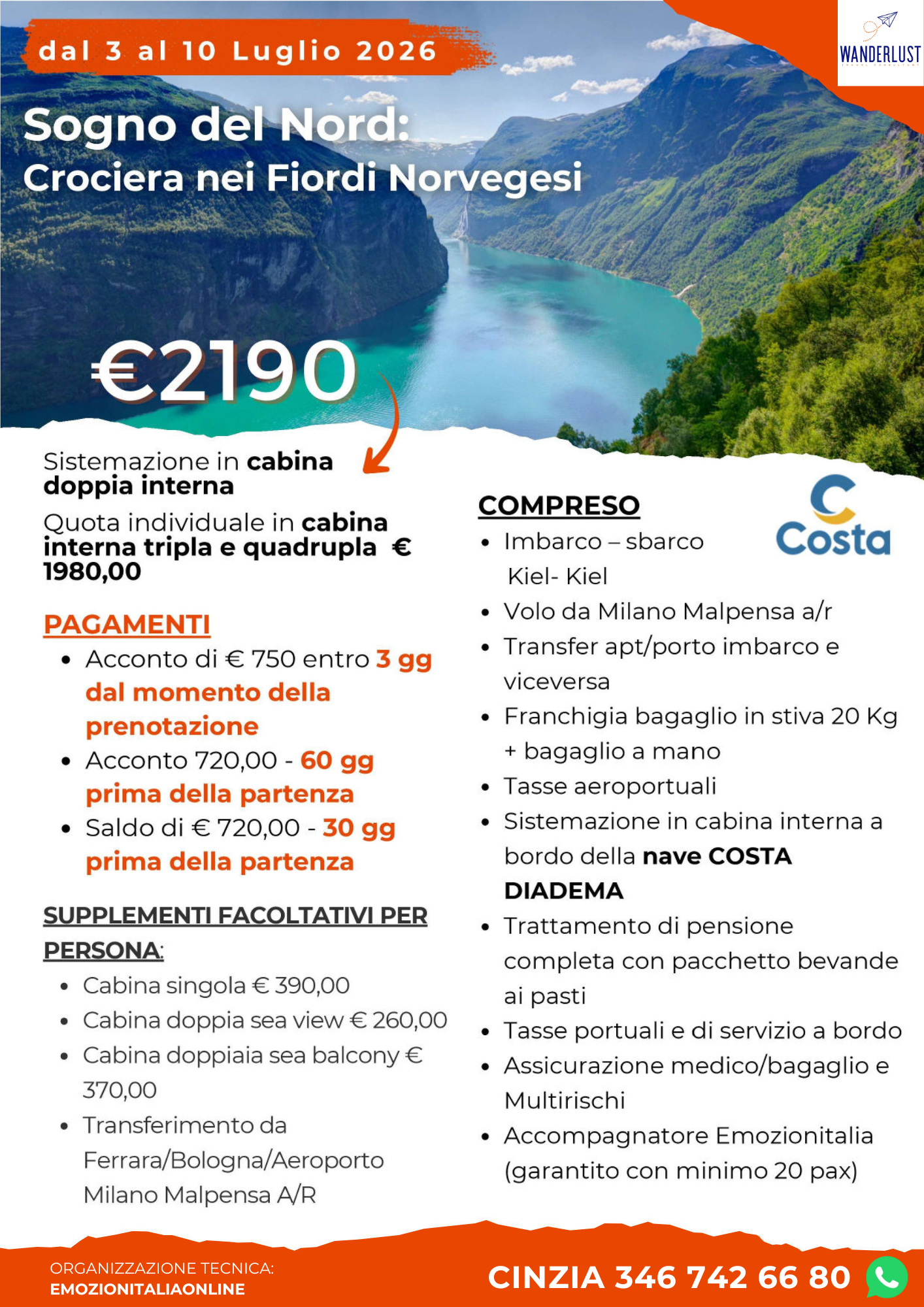 Una crociera tra i fiordi norvegesi a bordo della Costa Diadema, con partenza dal 3 al 10 luglio 2026. Itinerario tra Copenaghen, Geiranger, Bergen e Stavanger, con volo incluso e pensione completa. Un viaggio panoramico e suggestivo, tra natura incontaminata e città nordiche affacciate sul mare.