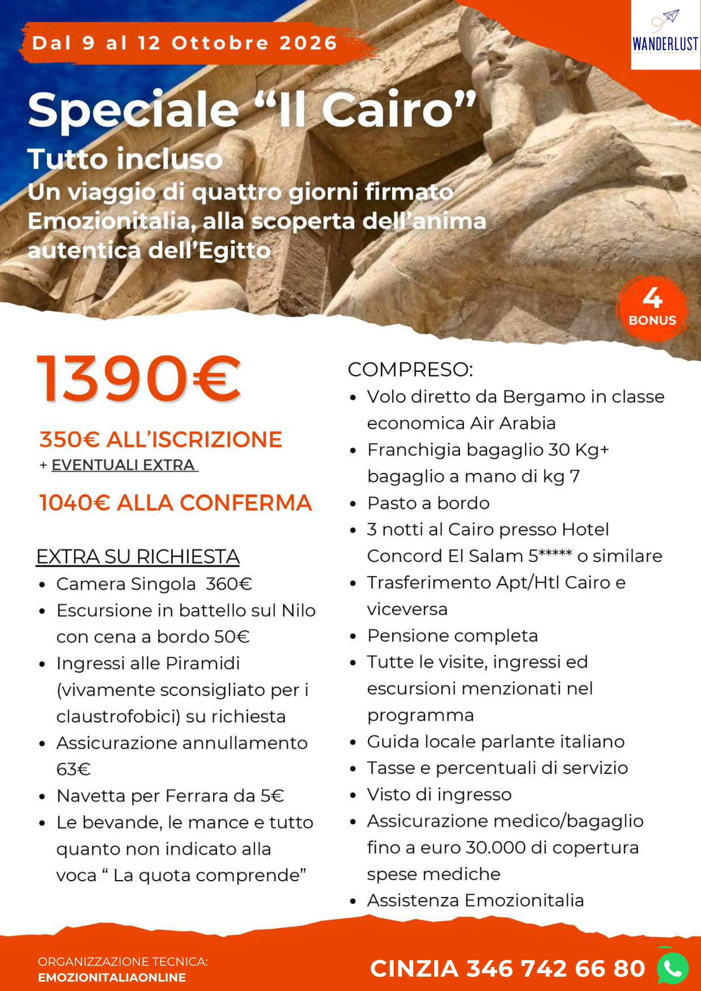 Possibilità di partenza in bus da Ferrara/Bologna per l’aeroporto di Bergamo. Imbarco sul volo in partenza alle 12:20 diretto a Il Cairo. Arrivo previsto alle ore 17:05, incontro con l’assistente locale e trasferimento in hotel 5* centrale. Sistemazione nelle camere riservate e tempo libero insieme all’accompagnatore di Emozionitalia, per assaporare l’atmosfera di questa città che vibra, respira e racconta più di cinquemila anni di storia. Cena e pernottamento in hotel.