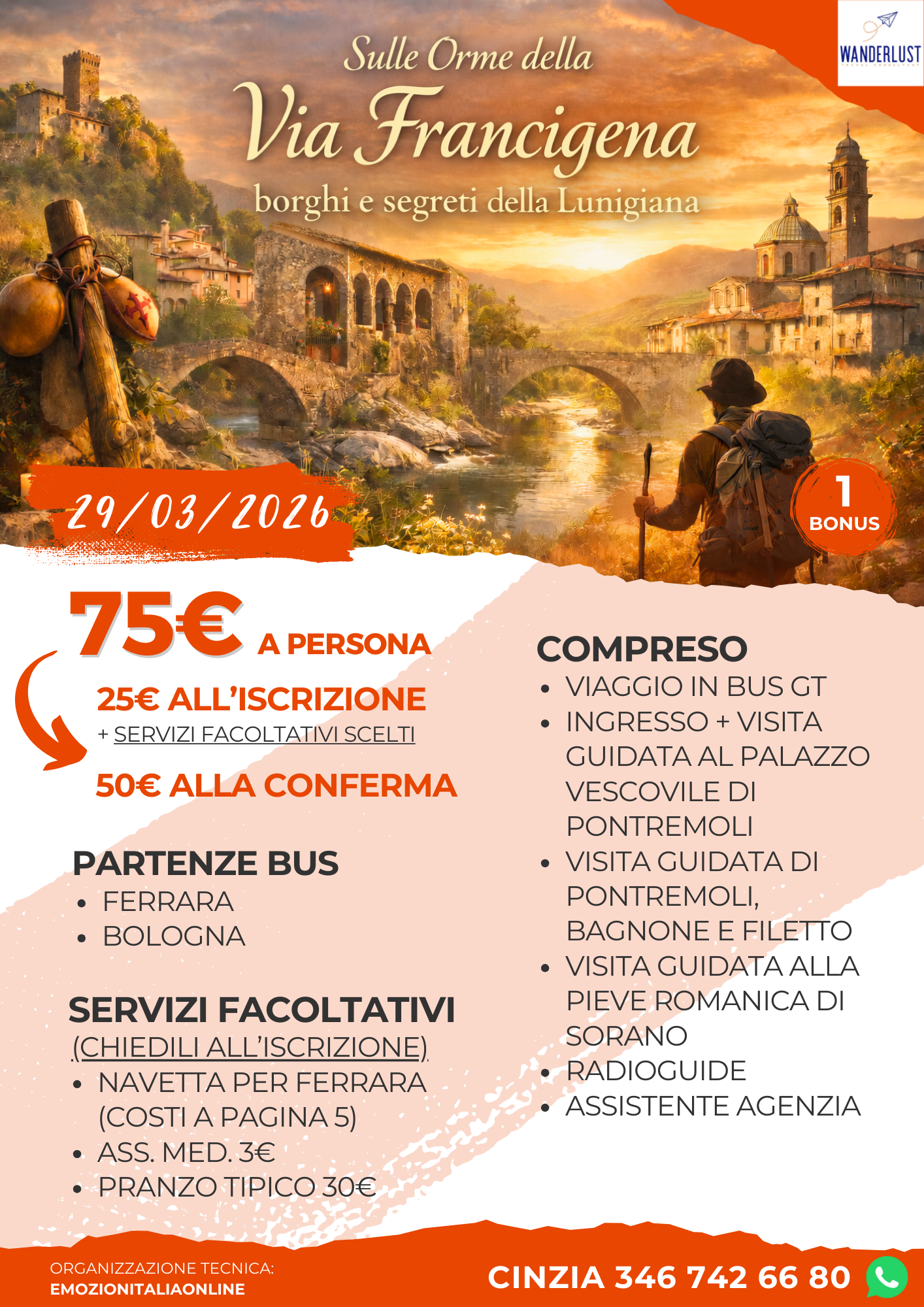Partiremo in bus da Ferrara e Bologna alla volta di Pontremoli, una delle tappe più affascinanti della Via Francigena. Qui inizieremo con la visita guidata al Museo del Palazzo Vescovile, dove scopriremo reperti e testimonianze legati al cammino dei pellegrini, tra cui anche la riproduzione del celebre Labirinto di San Pietro, simbolo di viaggio interiore e orientamento lungo la via spirituale. A seguire, faremo una breve passeggiata guidata nel centro storico, tra vicoli, scorci e atmosfere medievali che raccontano il passaggio di viandanti e mercanti. Dopo la visita, pausa pranzo libera. Noi proponiamo un menù tipico a 30€ a persona con testaroli al pesto, misto di salumi con torta tipica e pecorino con miele, e il dolce tradizionale Amor Pontremolese (acqua inclusa). Nel pomeriggio ci sposteremo verso Filetto e Bagnone, 2 borghi che sembrano usciti da un racconto e che conservano intatta l’anima della Lunigiana, terra di passaggio e accoglienza per chi percorreva la Francigena. Con la guida attraverseremo mura, archi e piazzette dove il tempo rallenta, seguendo un filo conduttore fatto di ospitalità, devozione e “strada”, proprio come avveniva per i pellegrini: luoghi piccoli, ma strategici, che offrivano riparo, acqua, mercati e punti di riferimento lungo il percorso. Concluderemo con una tappa davvero speciale: la Pieve di Sorano, un luogo raccolto e potentissimo per atmosfera, che richiama la dimensione più autentica della spiritualità.