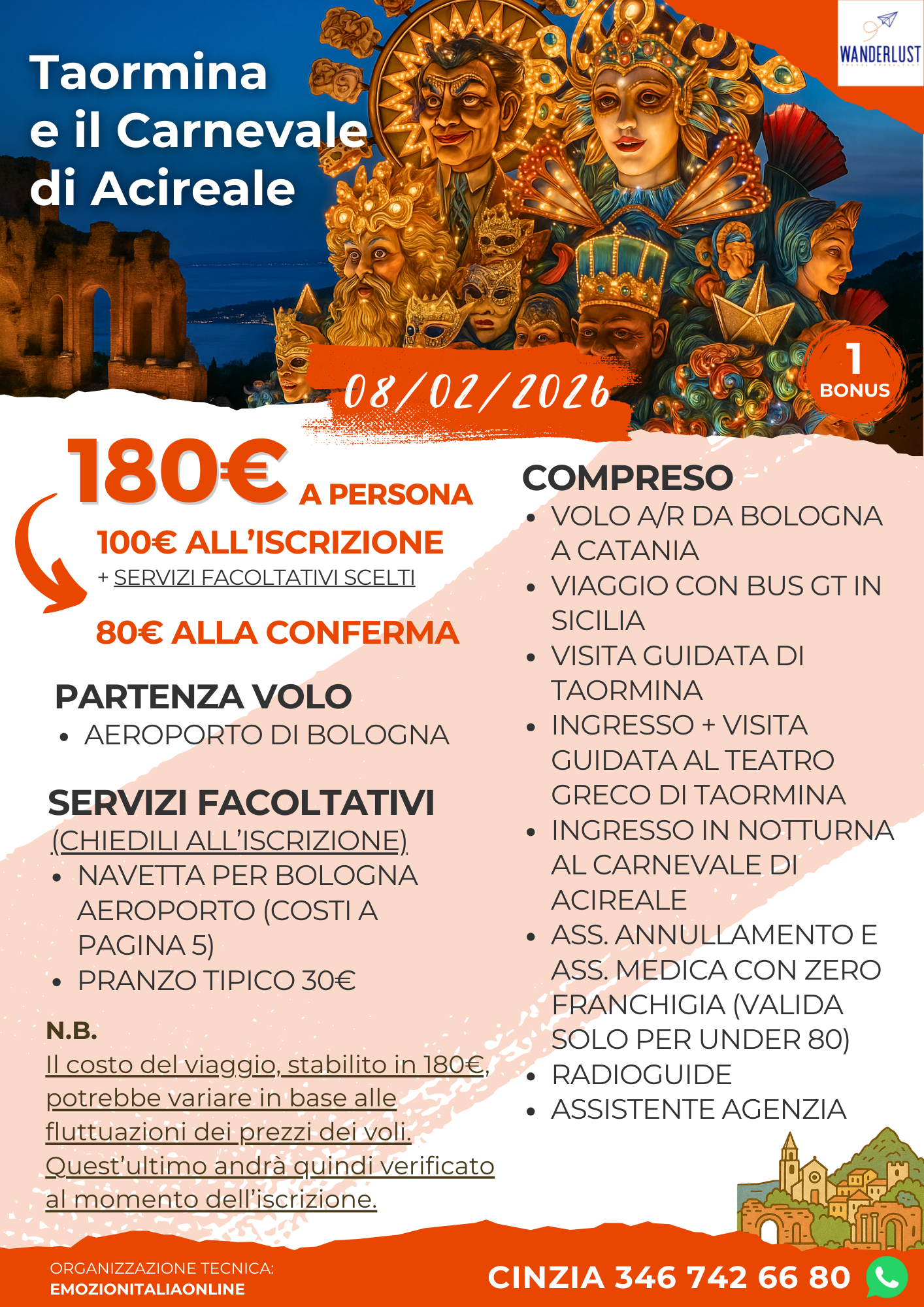 Chi lo desidera, potrà scendere in pochi minuti alle spiagge di Mazzarò e Isola Bella grazie alla funivia che collega il centro alla spiaggia in soli 3 minuti, esperienza che permetterà anche di godere di un panorama davvero suggestivo. Nel pomeriggio ci sposteremo al Carnevale di Acireale, uno dei più suggestivi d’Italia, celebre per i suoi carri allegorico-grotteschi, vere opere d’arte realizzate dagli artigiani locali, arricchite da luci, movimenti e scenografie che in serata diventano ancora più spettacolari. Lo vivremo in notturna, quando il centro storico si trasforma in un grande teatro a cielo aperto: musica, colori, coriandoli e animazioni renderanno l’esperienza ancora più coinvolgente. Al termine della giornata rientreremo in aeroporto, in tempo utile per il volo di ritorno delle 21:15, con arrivo previsto a Bologna intorno alle 22:30.
