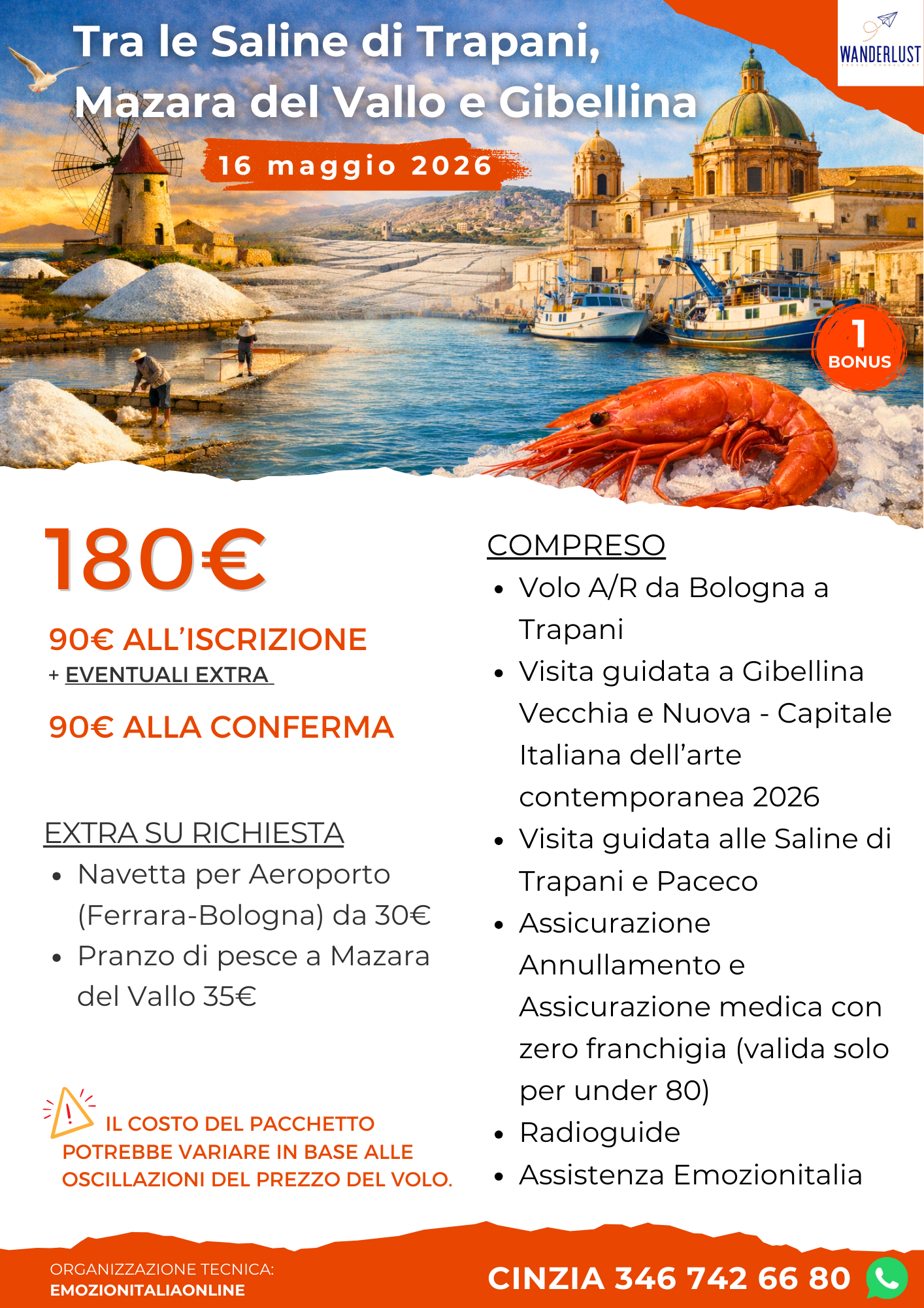 Una giornata in Sicilia tra arte e natura: visita guidata a Gibellina (Capitale Italiana dell’Arte Contemporanea 2026), il Grande Cretto di Burri, il borgo di Mazara del Vallo e le Saline di Trapani e Paceco. Volo A/R da Bologna incluso e assicurazione annullamento con zero franchigia.