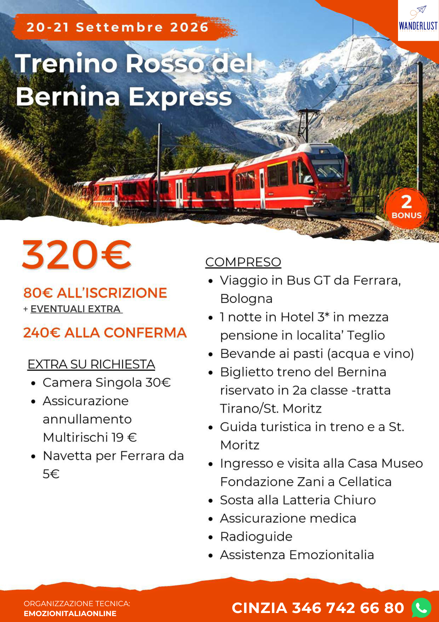 Prima colazione a buffet servita dalle 7.00 alle 10.00. Trasferimento in pullman a Tirano. Partenza con trenino rosso del Bernina (posti riservati) alle 9:41 con arrivo a St. Moriz dopo due ore e mezzo di viaggio spettacolare, tra verdi vallate, larici e laghetti panoramici. Servizio guida a bordo del treno. Visita guidata a St.Moritz. Al termine partenza per il rientro previsto in serata.