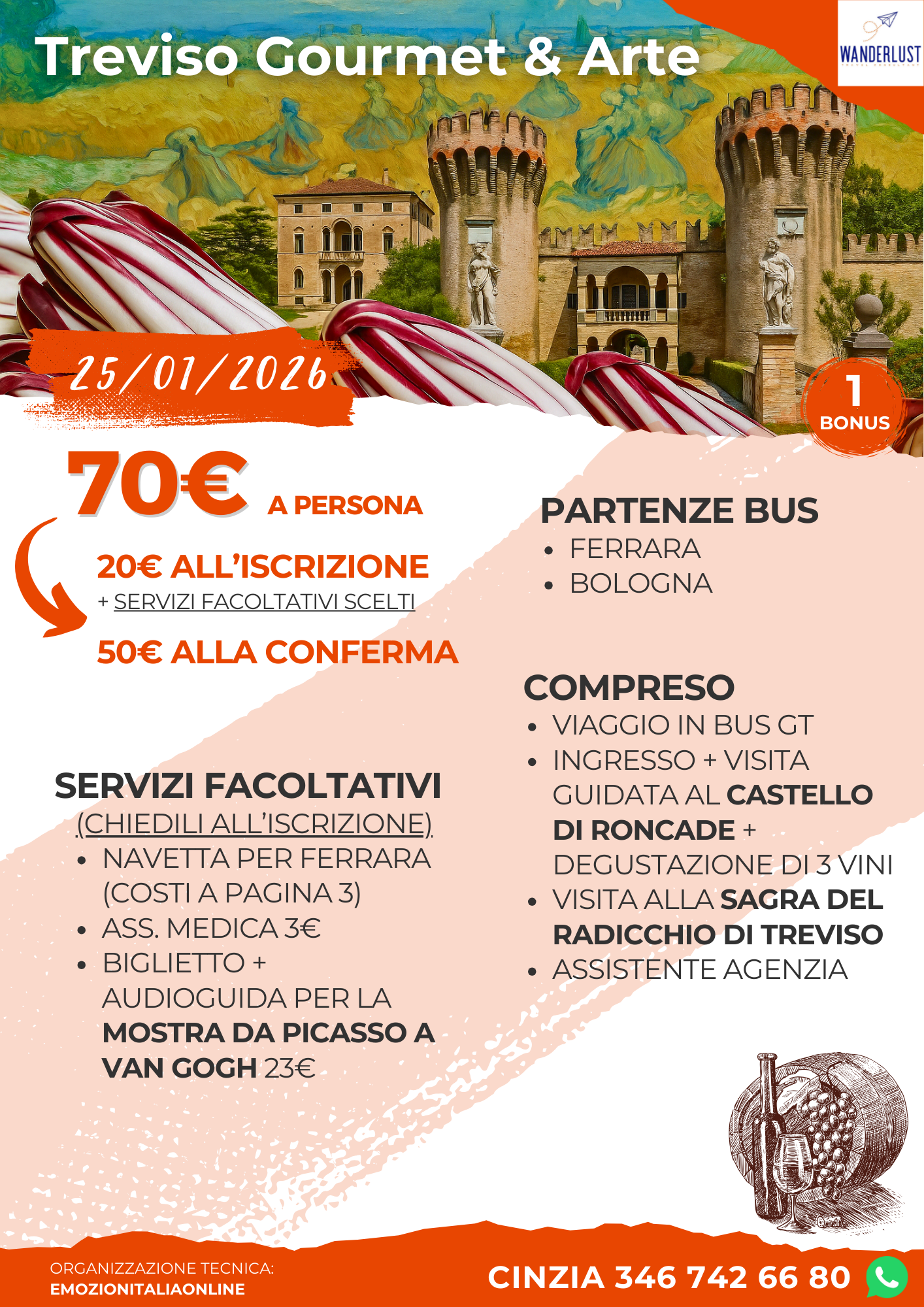 Partiremo in bus da Bologna e Ferrara per raggiungere il Castello di Roncade, dove, accompagnati da una guida scopriremo la storia della dimora. Visiteremo la sala principale e a seguire accederemo alle suggestive cantine di invecchiamento, dove i vini riposano in botti di rovere, con degustazione in piedi che prevede per ciascun partecipante un calice delle tre etichette più rappresentative dell’azienda: uno Spumante, un vino della selezione “Classici” e un vino della selezione “Icona”. Al termine ci sposteremo alla Sagra del Radicchio di Treviso a Dosson, con tempo libero per visitare gli stand, acquistare il radicchio direttamente dai produttori e pranzare in autonomia. Nel pomeriggio raggiungeremo il centro di Treviso, con tempo libero per scoprire la città e, per chi lo desidera, possibilità di ingresso alla grande mostra internazionale “Da Picasso a Van Gogh” al Museo Santa Caterina: un’esposizione unica in Europa che riunisce oltre 60 capolavori provenienti dal Toledo Museum of Art, in un percorso che racconta la pittura dall’impressionismo e post-impressionismo europeo fino all’astrazione americana del Novecento, con opere di maestri come Monet, Cézanne, Gauguin, Renoir, Picasso, Van Gogh, Mondrian e Hopper. Il pacchetto facoltativo ingresso mostra + audioguida è proposto a 23 € a persona.
