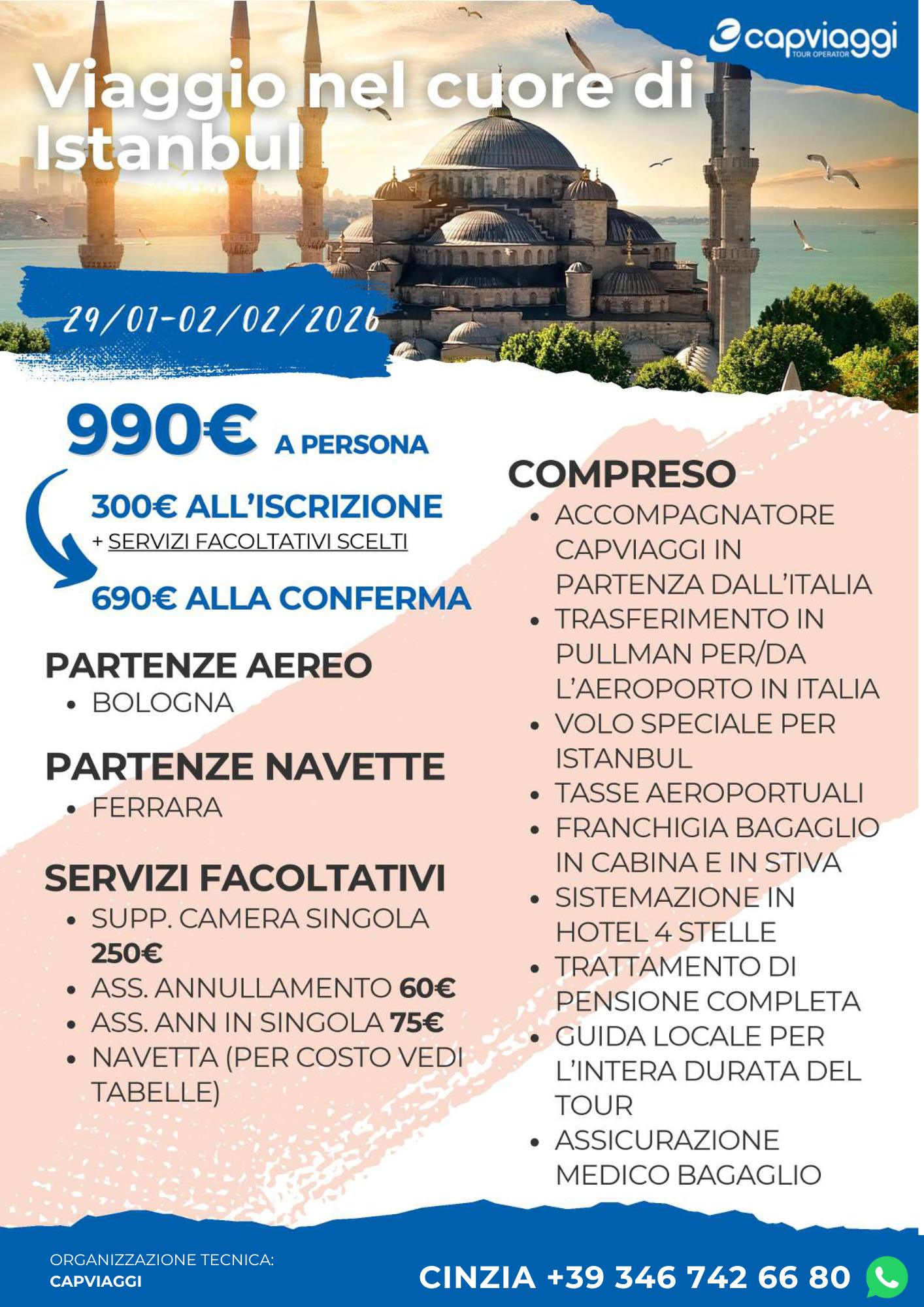 Scopri la magia di Istanbul in un viaggio tra due continenti! Dall’eleganza senza tempo della Moschea Blu ai mosaici dorati di Santa Sofia, passando per i vicoli infiniti del Gran Bazaar e i panorami mozzafiato del Bosforo: Istanbul ti conquista con la sua storia millenaria, i profumi delle spezie, i palazzi dei sultani e i quartieri sospesi tra Europa e Asia. Un viaggio ricco di emozioni, sorprese e meraviglie… dove l’Oriente abbraccia l’Occidente!