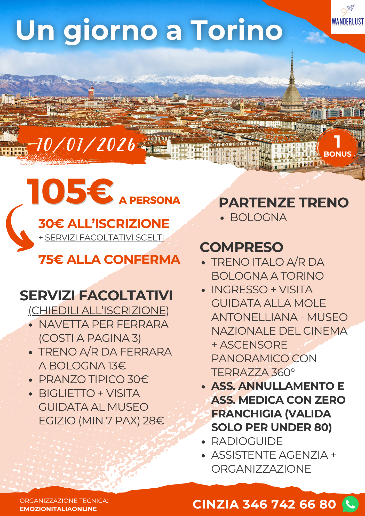 Partiremo con un treno Italo da Bologna alle ore 08:06 per arrivare a Torino alle 10:30. Per chi parte da Ferrara, è previsto il treno regionale delle 06:47 insieme all’accompagnatore (supplemento di €13 sul pacchetto). All’arrivo, ci sposteremo a piedi verso la Mole Antonelliana che ospita il celebre Museo Nazionale del Cinema attraversando alcune delle zone più eleganti di Torino. Una guida ci accompagnerà attraverso un percorso immersivo tra lanterne magiche, set cinematografici, proiezioni, manifesti storici e curiosità sul mondo del grande schermo. La visita include anche la salita in ascensore panoramico fino alla terrazza, da cui si gode una spettacolare vista sulla città e sull’arco alpino. Al termine, pausa pranzo presso un ristorante del centro al costo di €30 a persona con menù tipico: Antipasto misto piemontese a base di Vitello tonnato, Battuta di fassona con fonduta di Parmigiano e Tomini al verde; a seguire Plin al sugo d’arrosto con gel d’arancia (acqua e caffè inclusi). Nel pomeriggio, tempo libero per passeggiare tra le vie del centro o dedicarsi allo shopping sotto i portici. Per chi lo desidera, possibilità di visita guidata al Museo Egizio (minimo 7 partecipanti, al costo di 28€), uno dei più importanti al mondo dopo quello del Cairo, con una collezione di oltre 30.000 reperti che raccontano 4.000 anni di civiltà. Il rientro è previsto con treno Italo alle ore 17:20, con arrivo a Bologna alle 20:00 circa